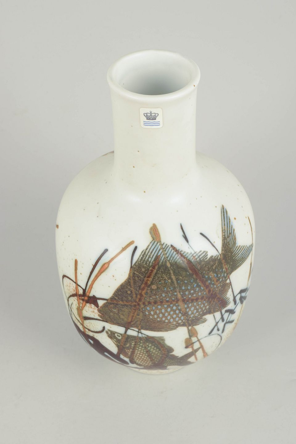 Stor vase i stentøj dekoreret med stiliseret havbundsmotiv med fisk og vegetation i dæmpede brunlige, blå og grønne nuancer. Modellenummer 1064 / 5363. Første sortering med original fabriksmærkat.