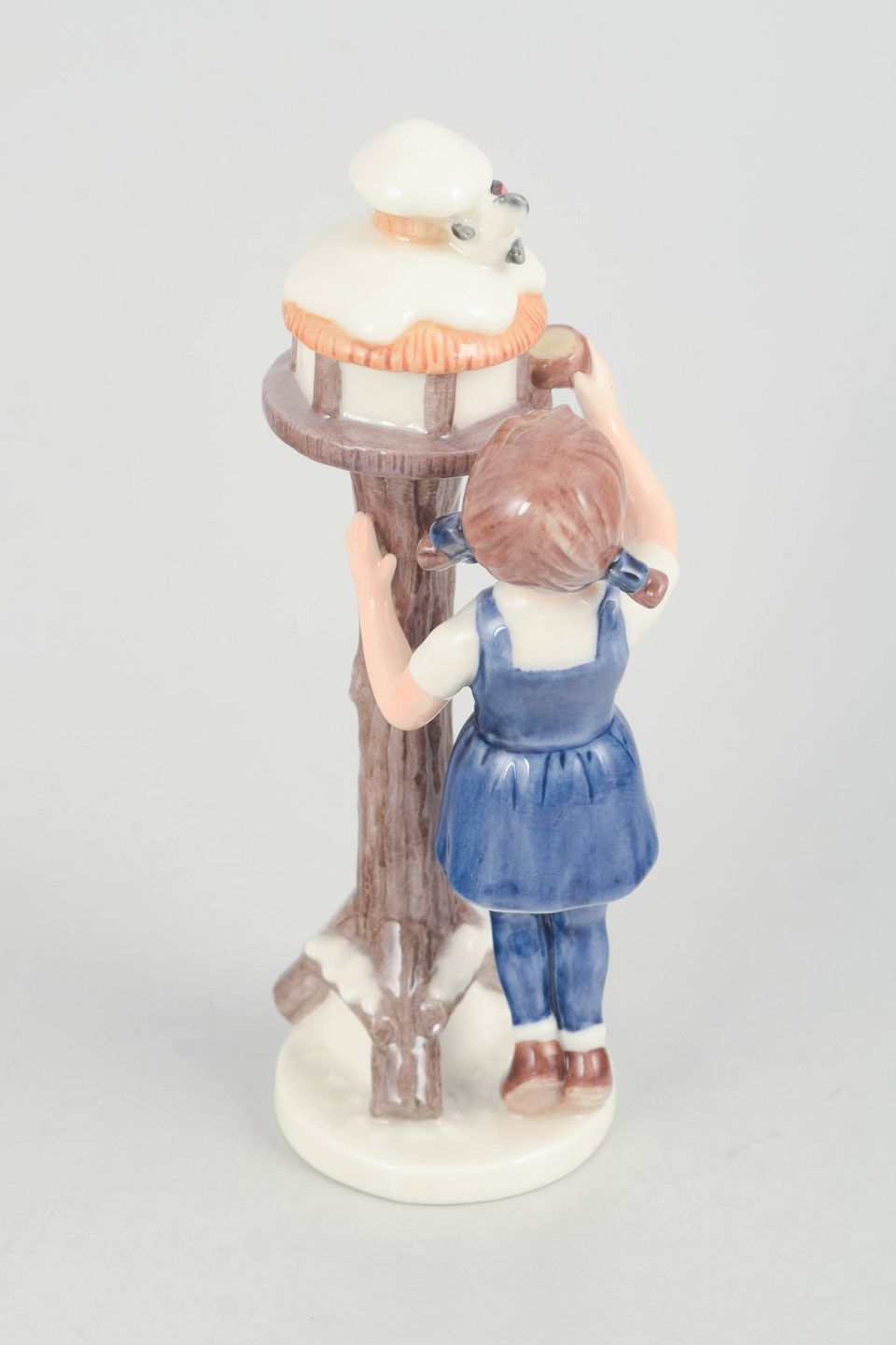 Fin porcelænsfigur af en pige i blå dragt stående ved et fuglehus på træstamme med detaljeret bemaling. Model 757, første sortering.