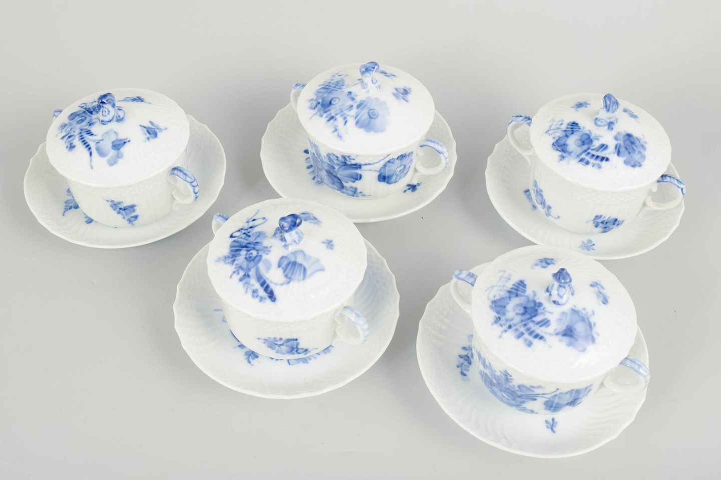 Royal Copenhagen Blå Blomst Svejfet, sæt af fem bouillonkopper med underkopper.