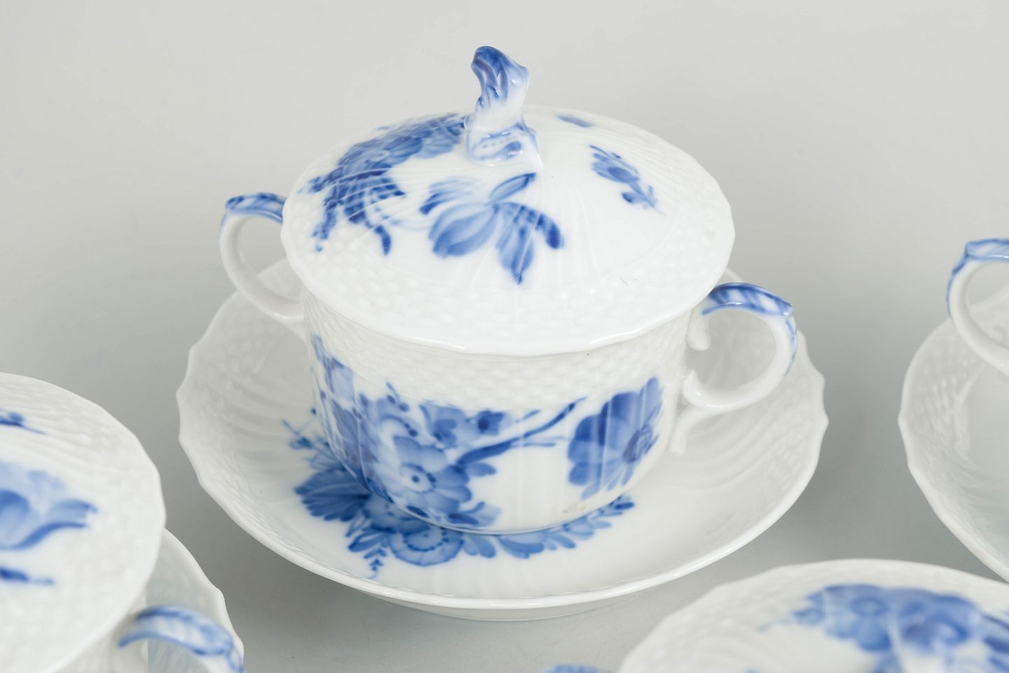 Sjældent sæt af bouillonkopper med låg i porcelæn, dekoreret i det klassiske håndmalede Blå Blomst Svejfet mønster. Model 10/1552, første sortering, dateret 1962.