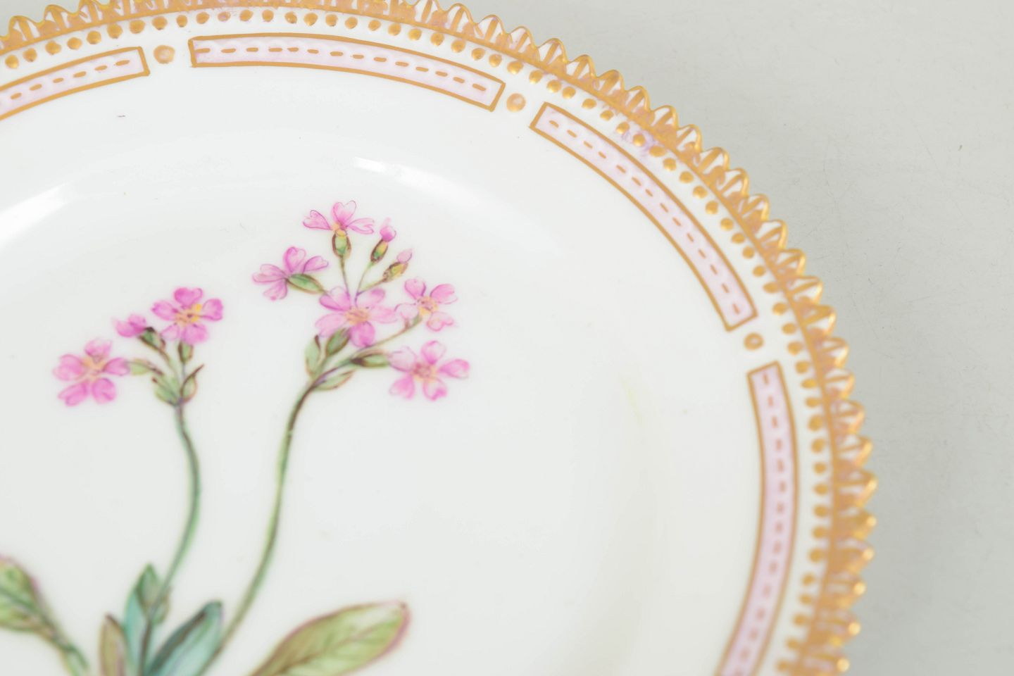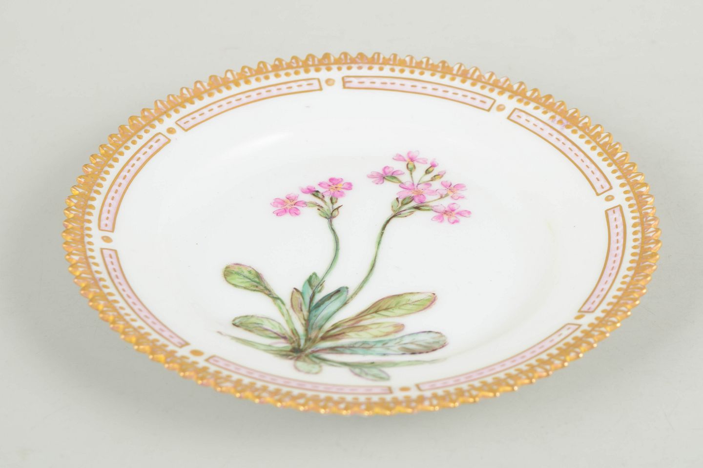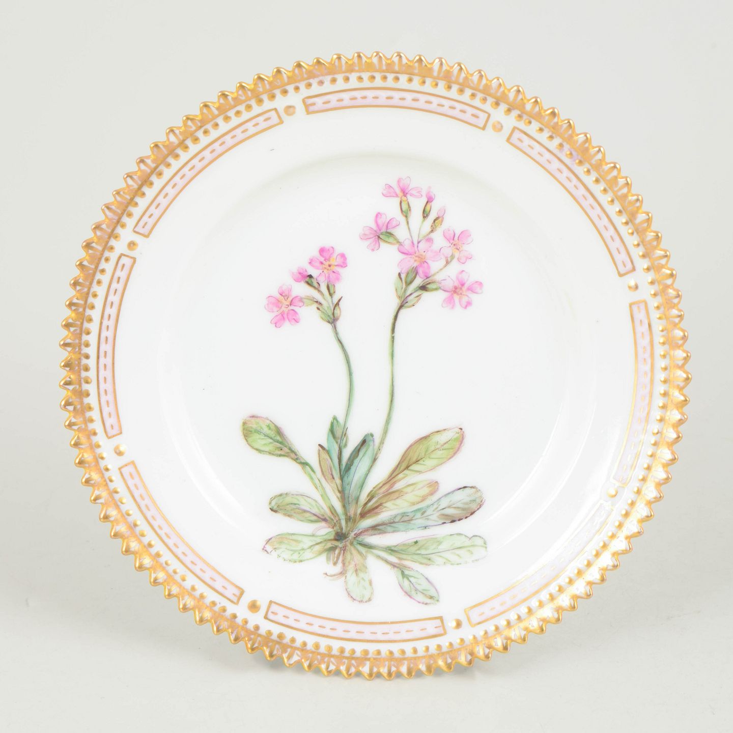 Hånddekoreret porcelænstallerken med botanisk motiv fra Flora Danica-serien, hjemmedekoreret, fint udført med forgyldt rand og detaljerig gengivelse af planter.