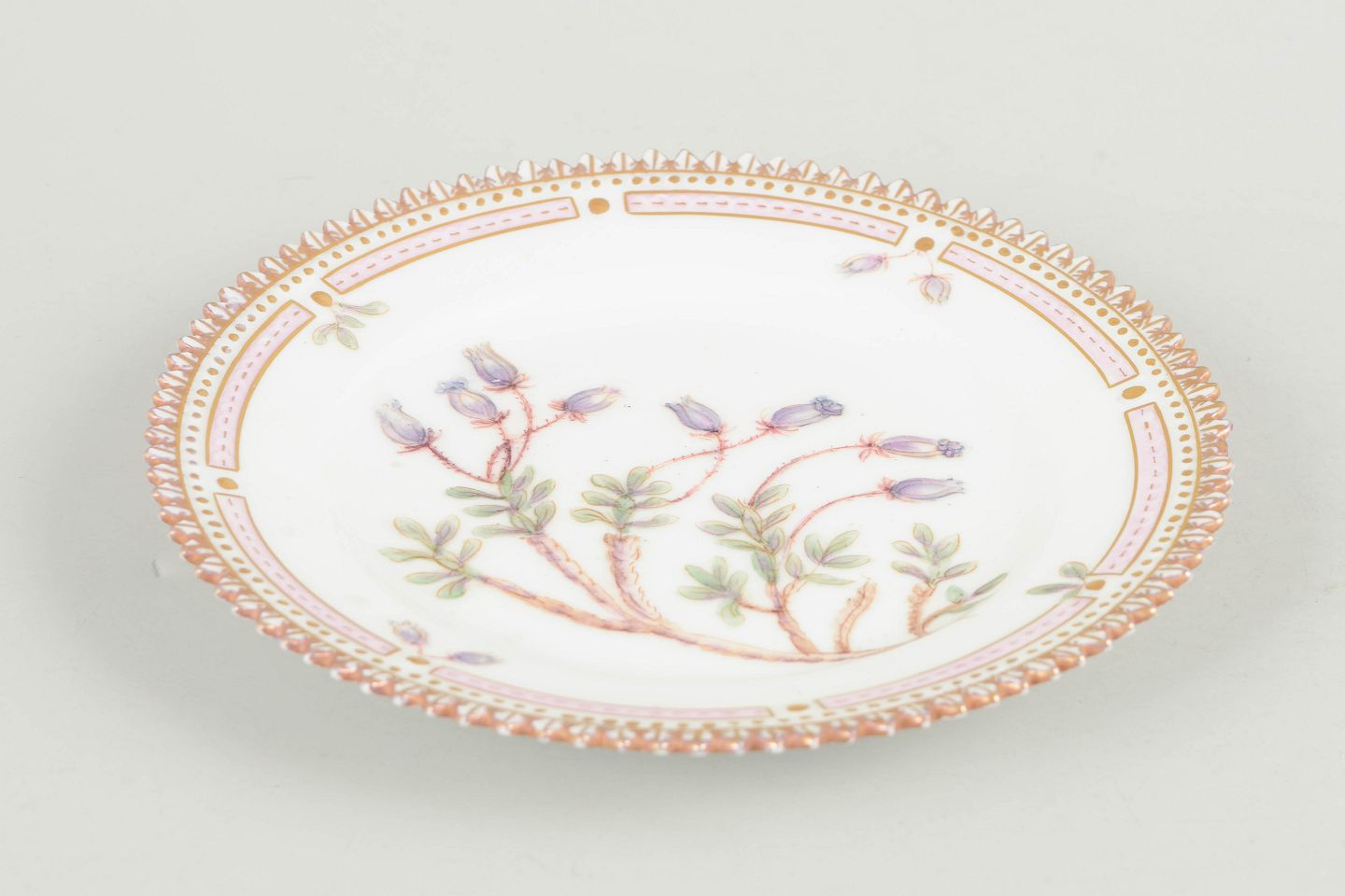 Hånddekoreret porcelænstallerken med botanisk motiv fra Flora Danica-serien, hjemmedekoreret, fint udført med forgyldt rand og detaljerig gengivelse af planter.
