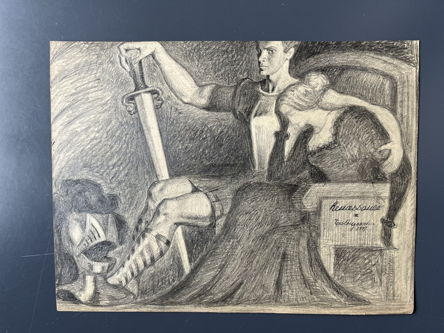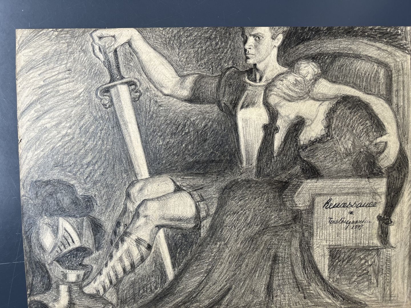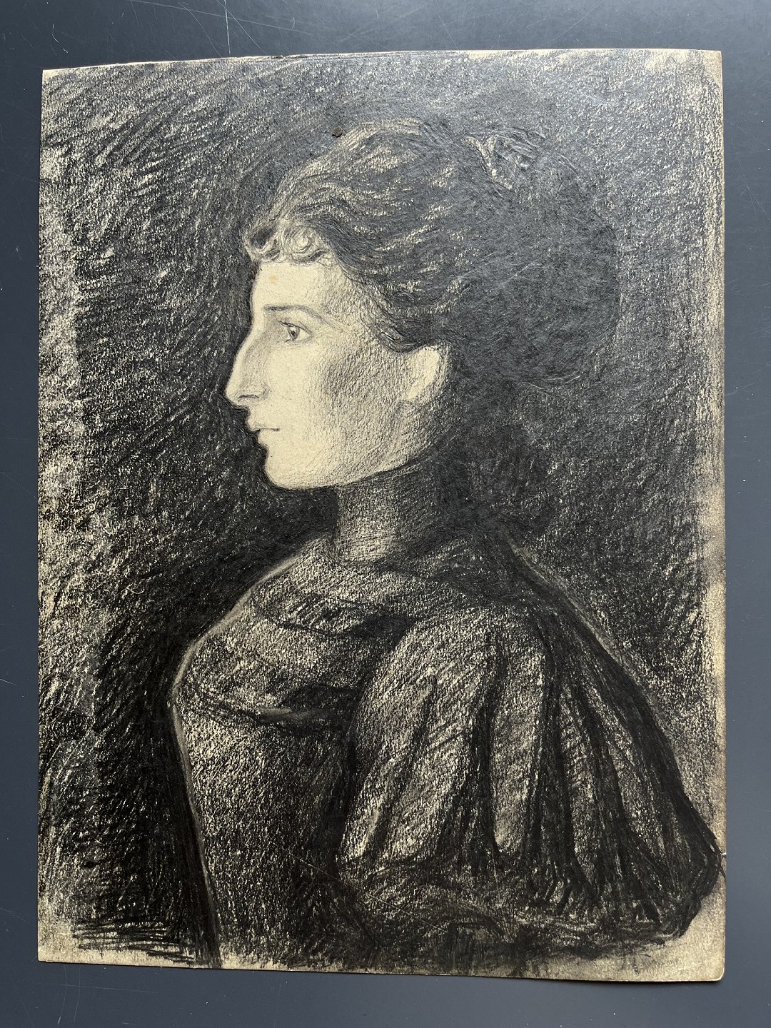 Bagpå tegning af smuk ung kvinde (bly/kul)