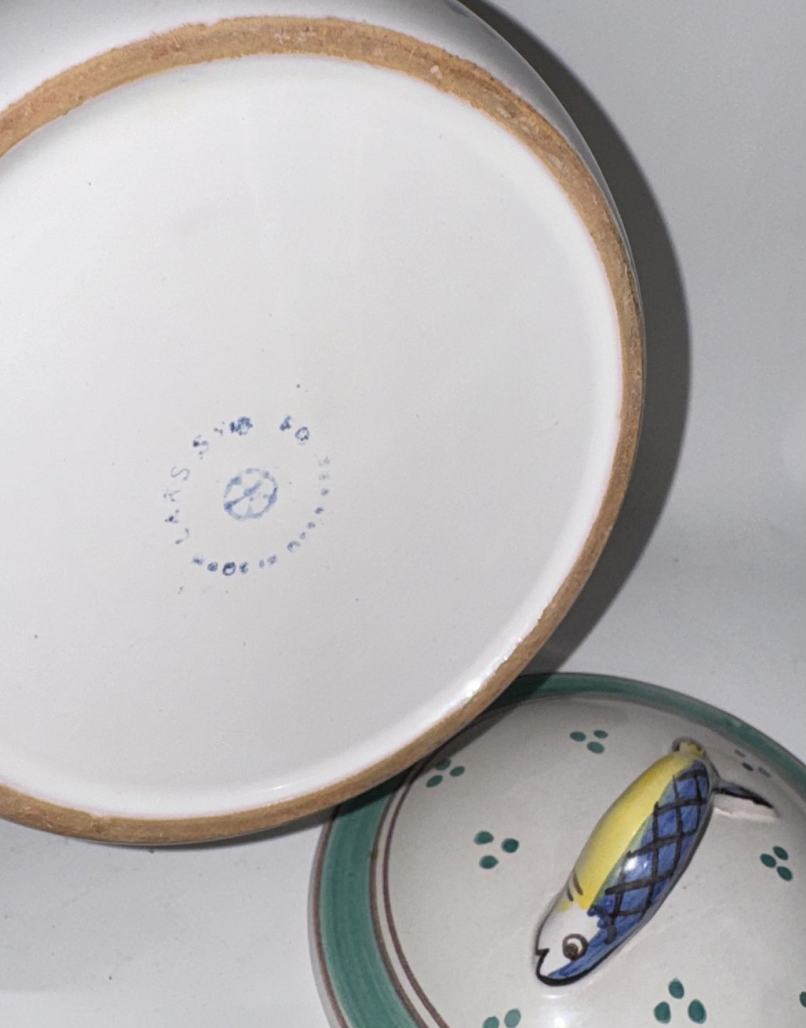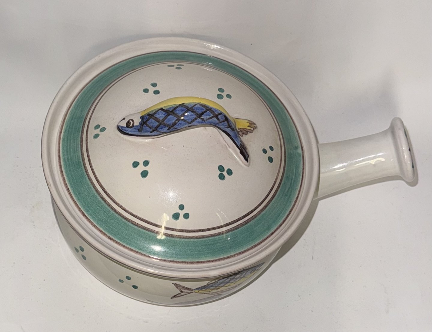 SKÅL TIL JULESILD, påskesild og hverdagssild - Skål med låg og håndtag i keramik fra Lars Syberg keramik værksted. Dekoreret med bemalede sild og figur af sild som lågknop. Fabriksmærket på bunden. Mål: H. 13 cm L. 23,5 cm d. 16,8 cm