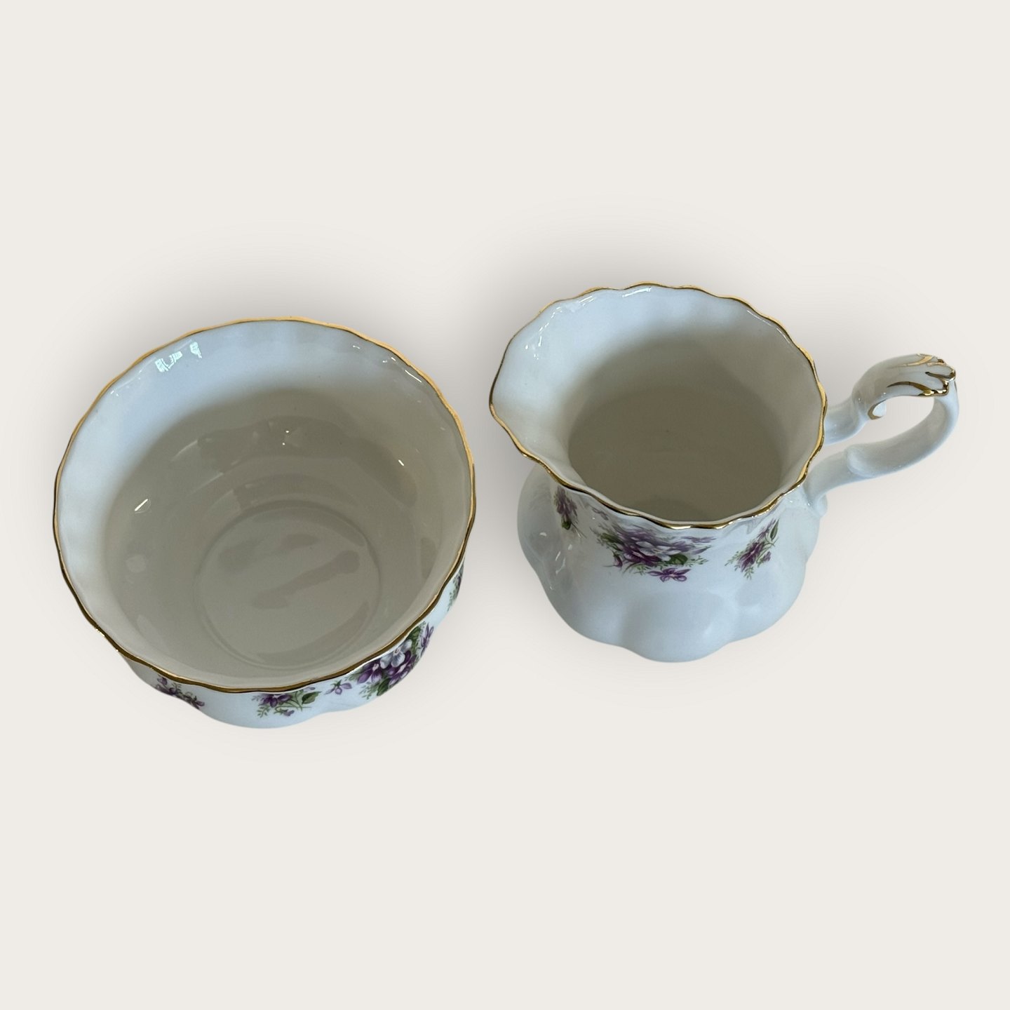 Royal Albert, Bone China, Sweet violets, Mark viol, Sukker, flødesæt, diameter sukkerskål 9cm, flødekande højde 9cm *Perfekt stand*