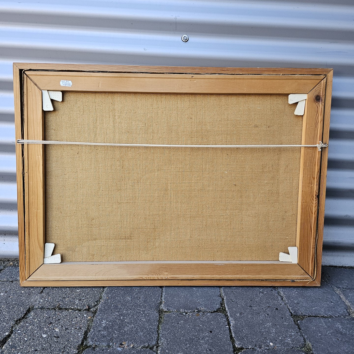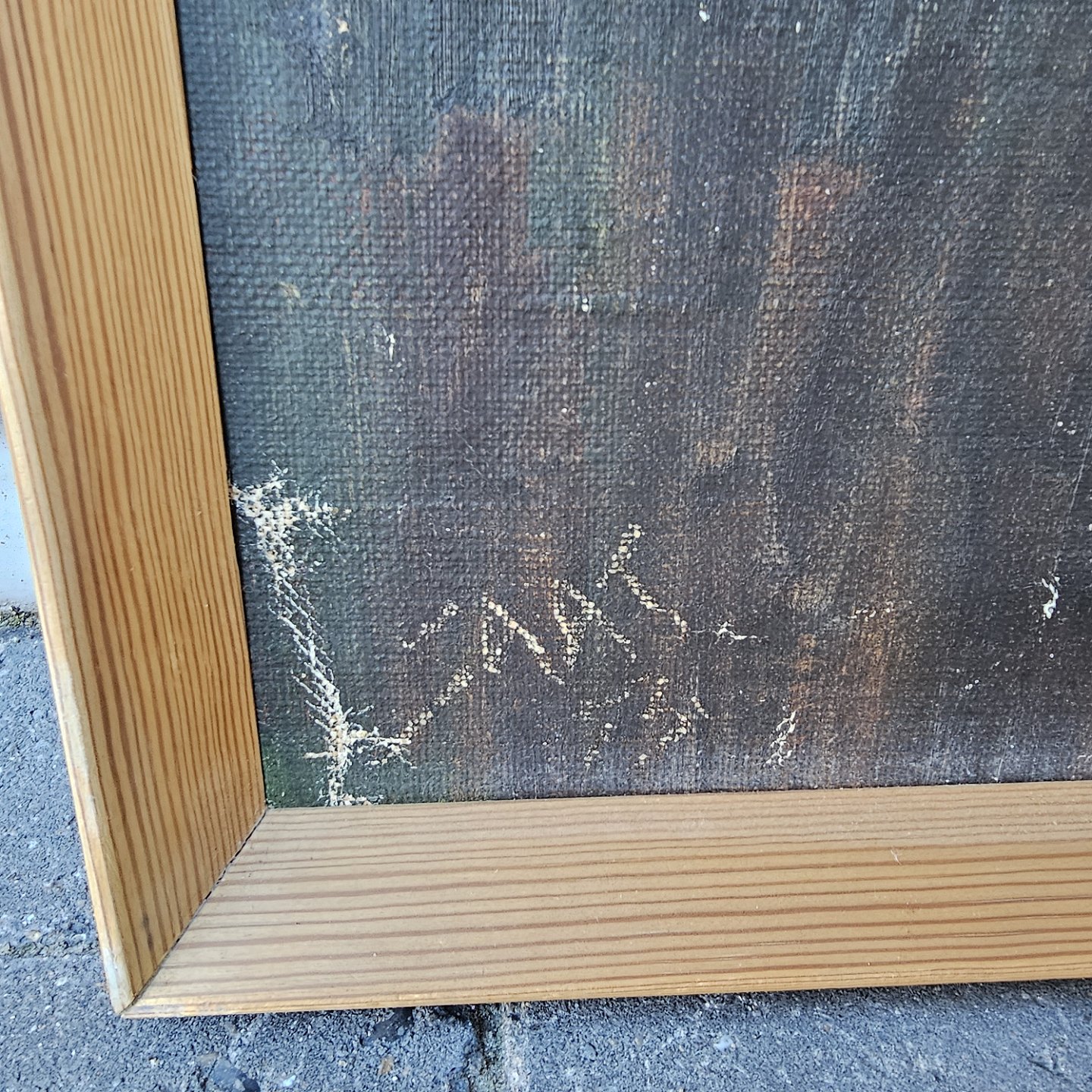 Oliemaleri på lærred med motiv af en kirke i et landsby landskab. Monteret i træramme
