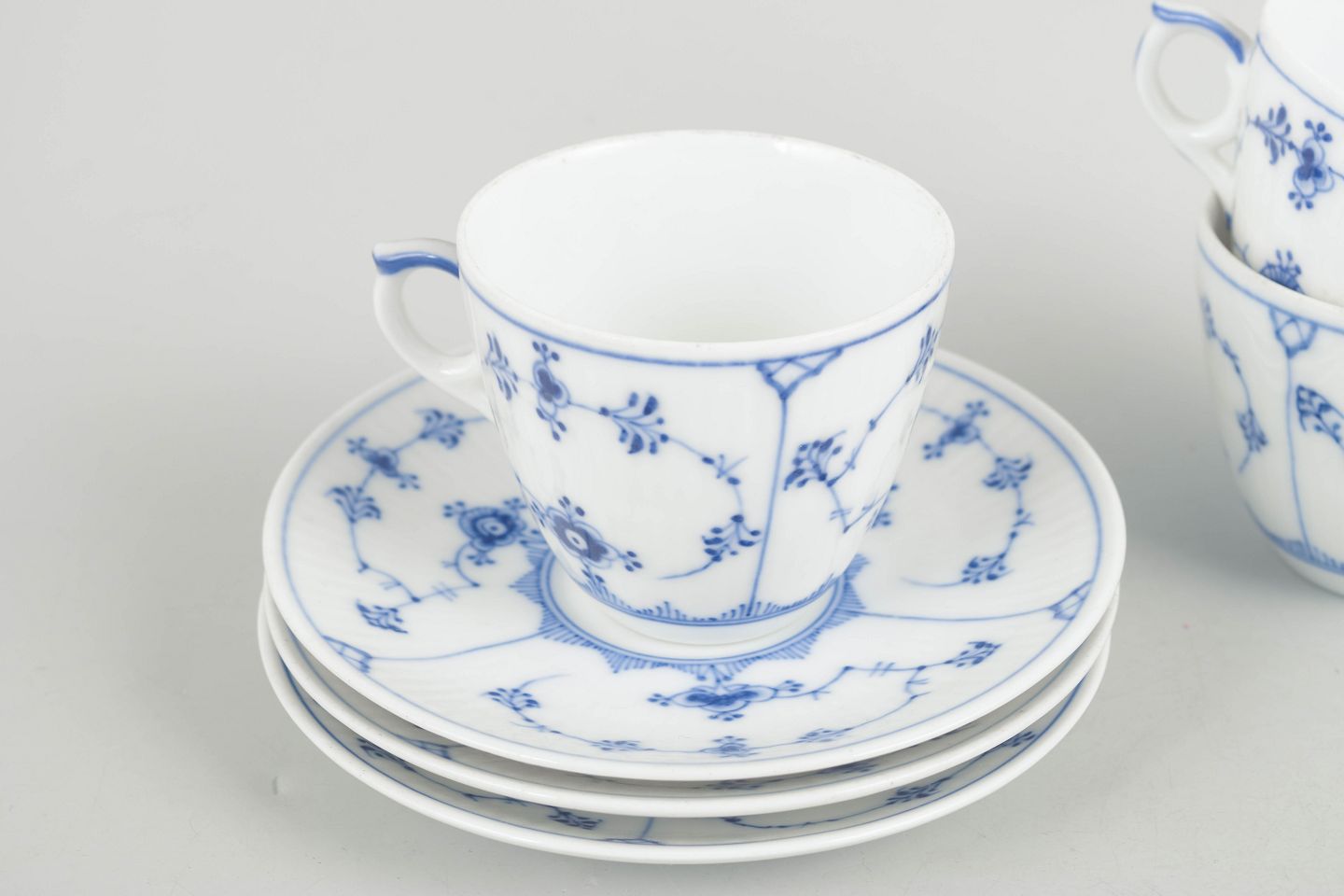 Tre kaffekopper med tilhørende underkopper i porcelæn med håndmalet dekoration i underglasurblå i det klassiske Musselmalet Riflet mønster. Model 1/80. Første sortering.