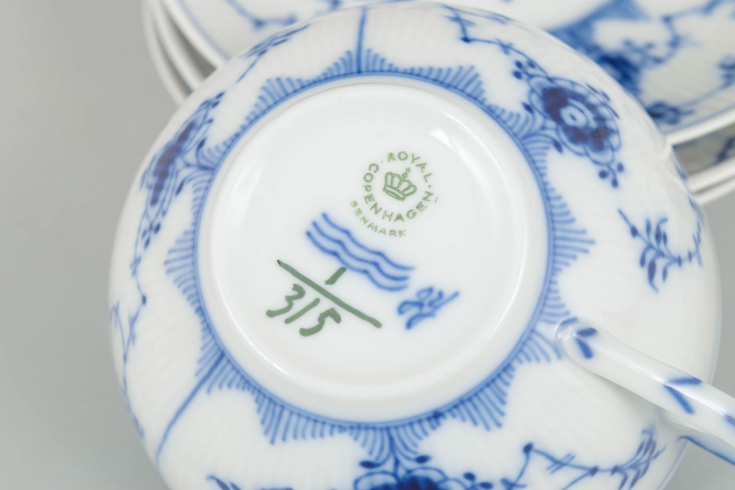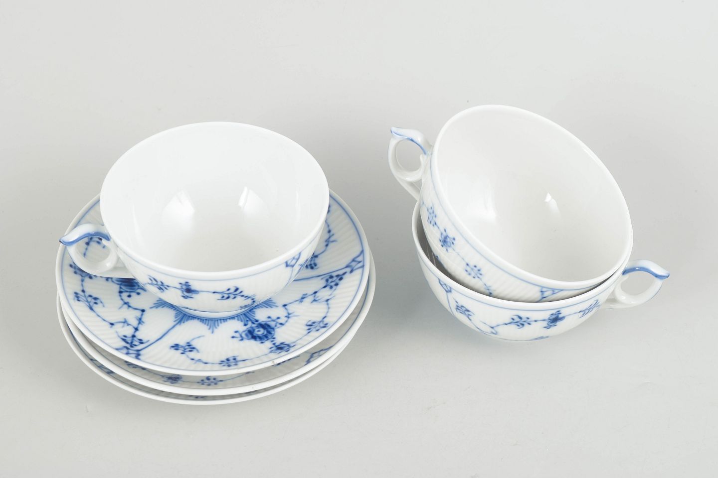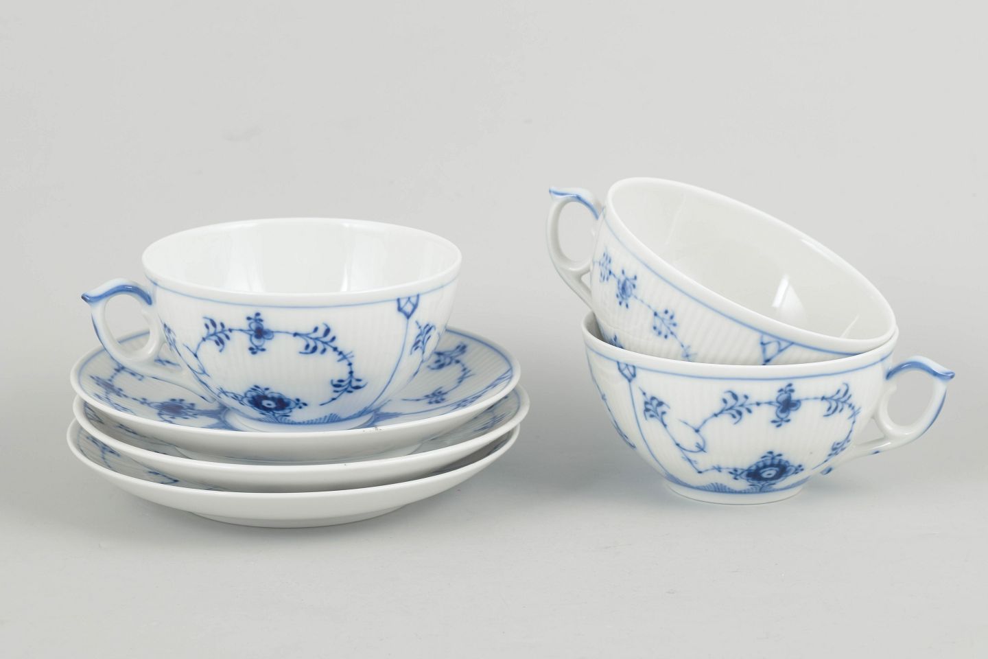 Royal Copenhagen Musselmalet Riflet, sæt af tre tekopper med underkopper.