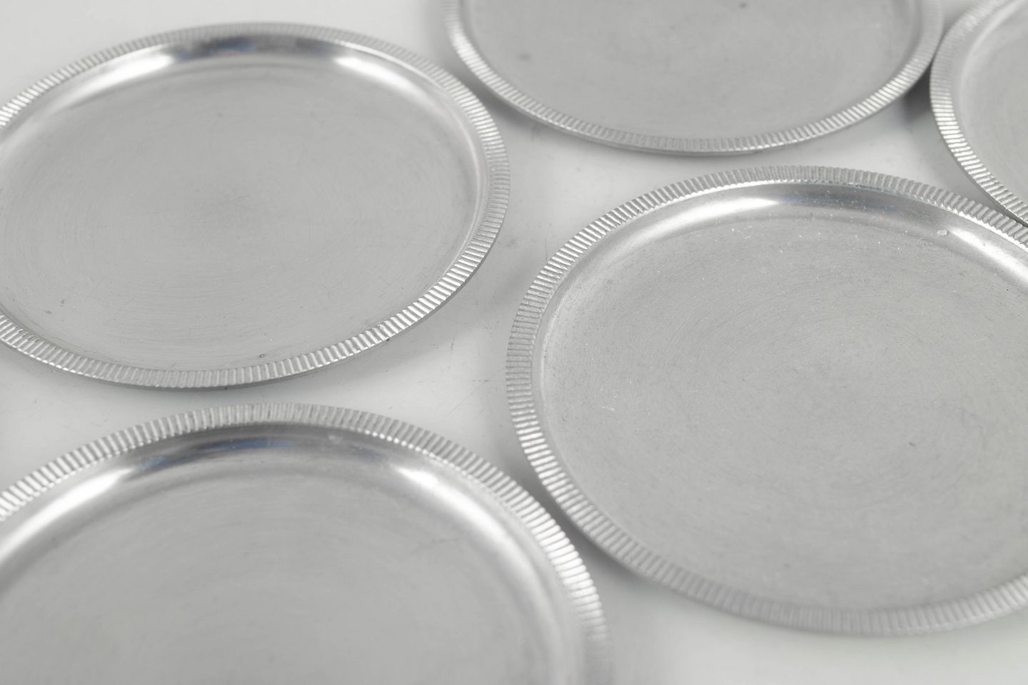 Set of eight coasters in pewter with a fluted rim and a simple art deco design. Model 2634.
