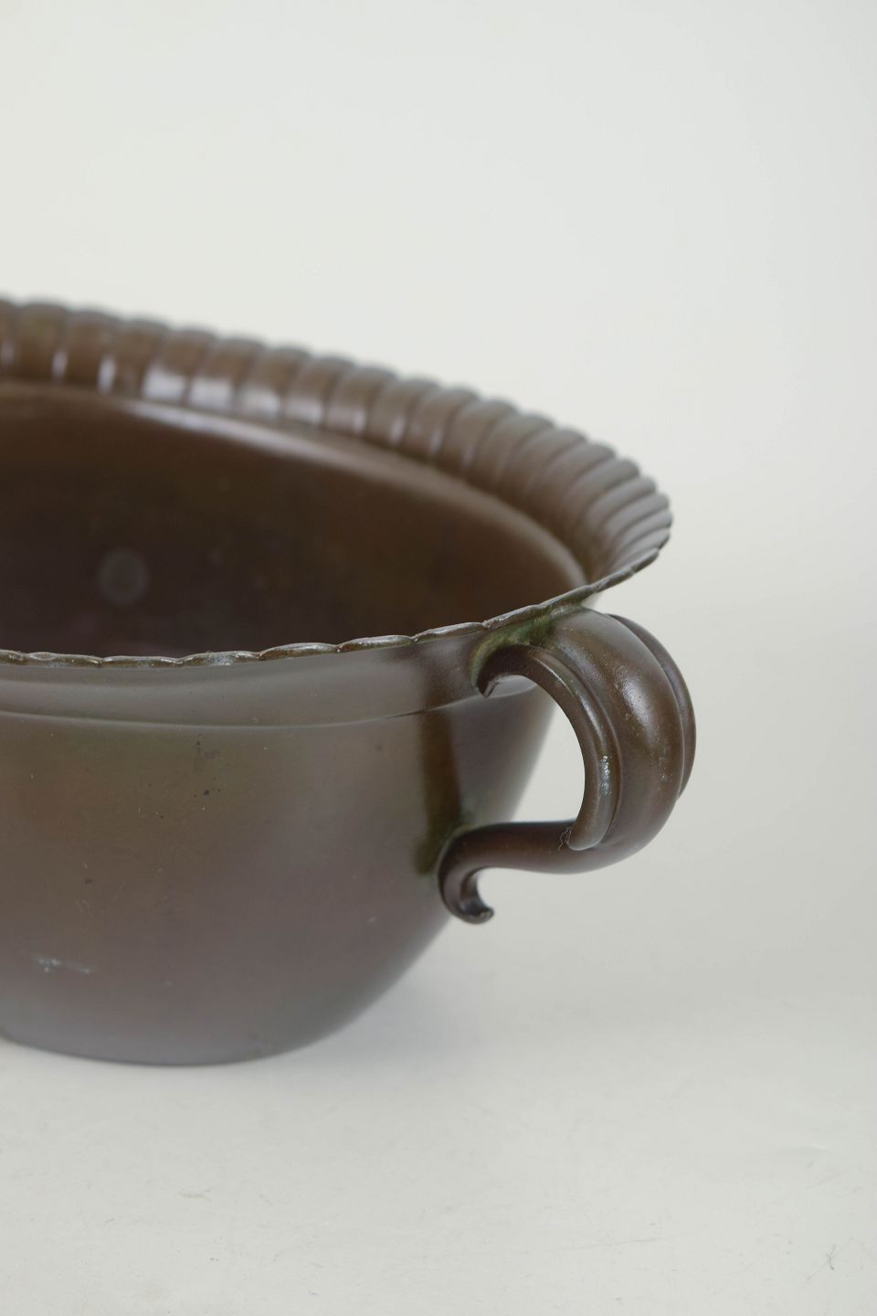 Bowl in disko metal with two curved handles and a fluted rim, executed in a distinctive art deco design. Model 1819A.