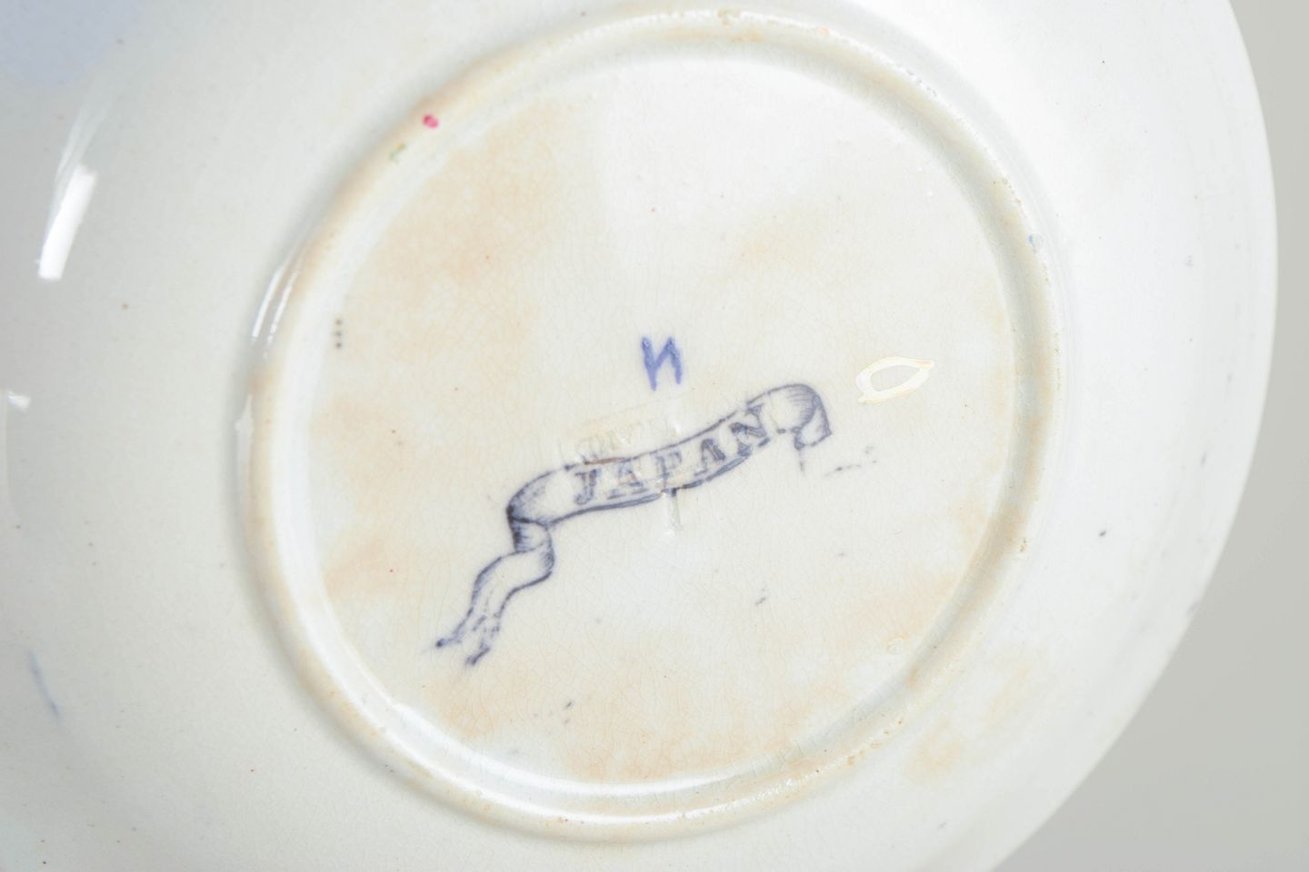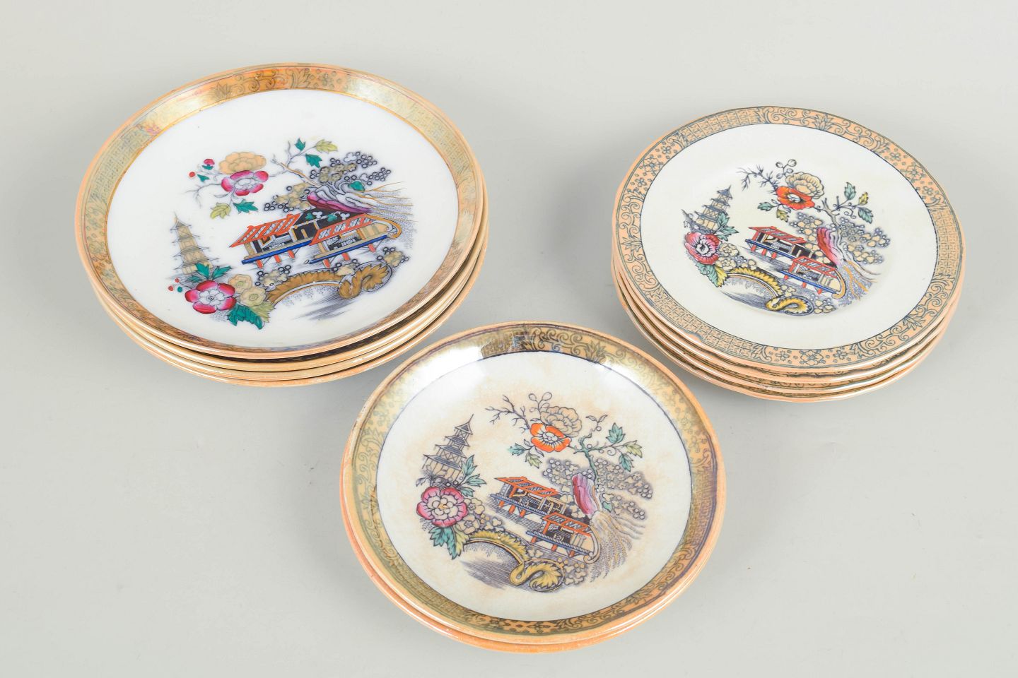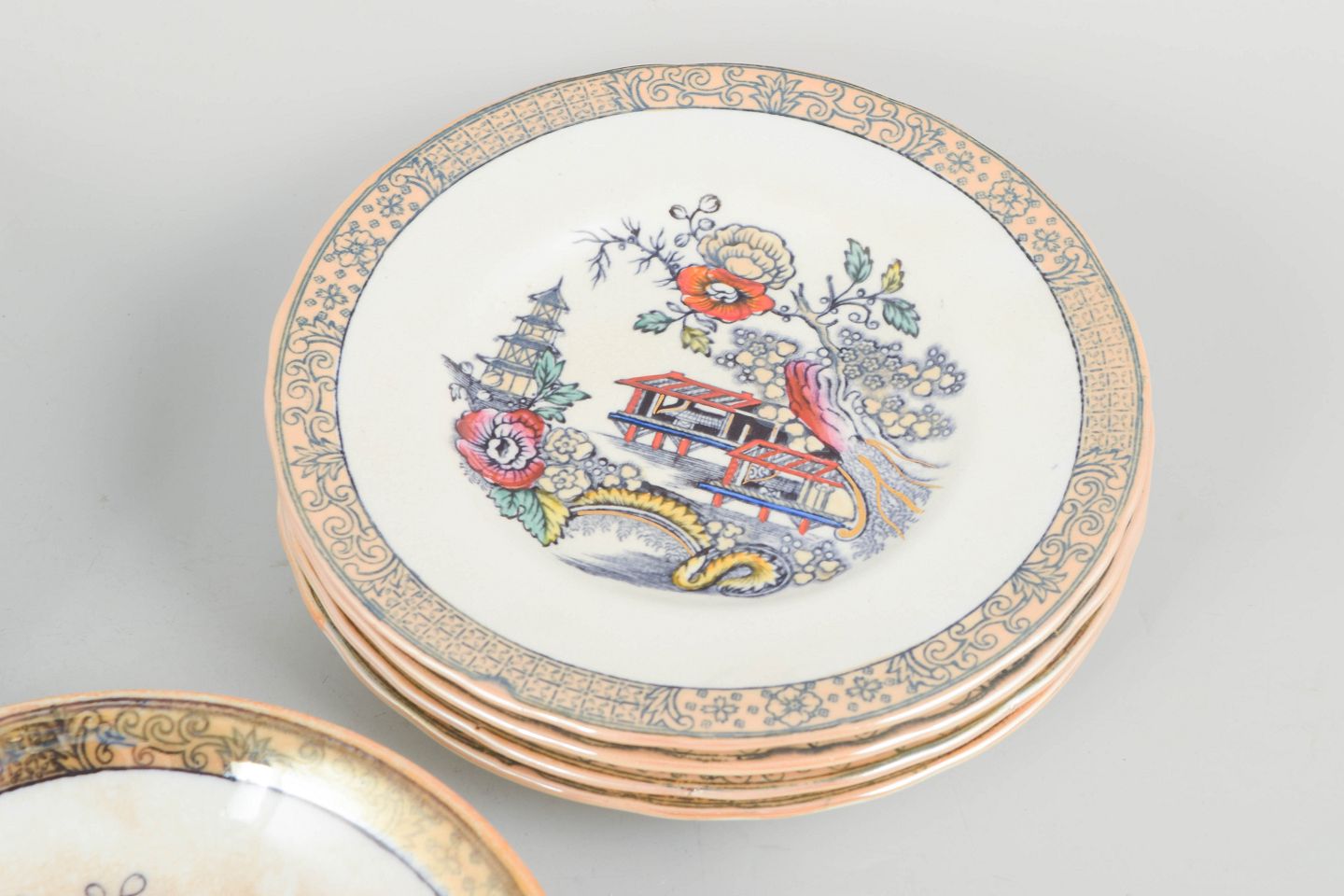 Flade og dybe tallerkener i fajance med orientalsk inspireret dekoration i polykrome farver og detaljerig bemaling i japansk stil, karakteristisk for Rörstrands japanismeproduktion fra begyndelsen af 1900-tallet.
