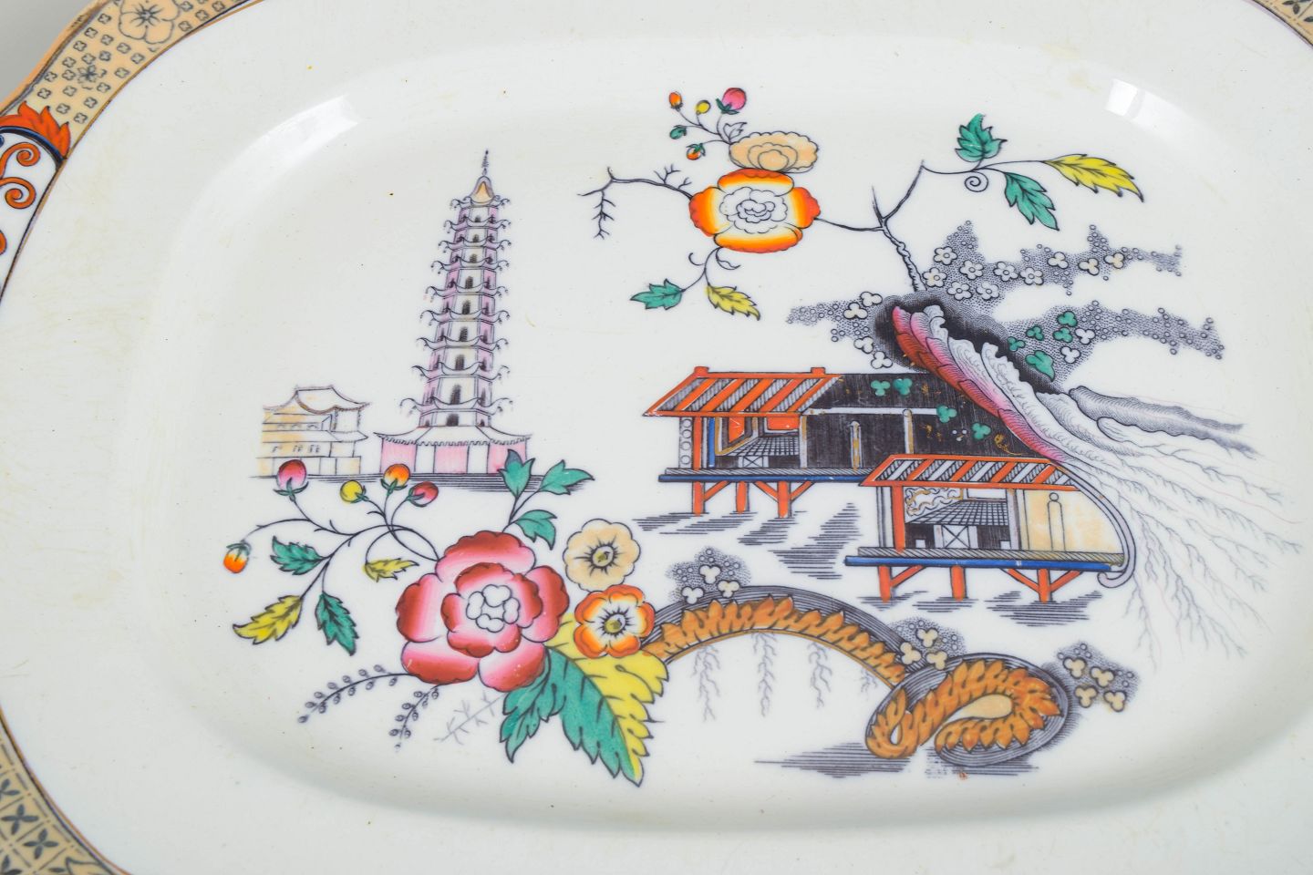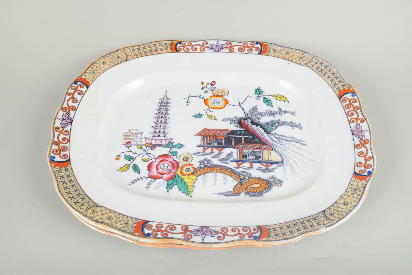 Store serveringsfade i fajance med orientalsk inspireret dekoration i polykrome farver og detaljerig bemaling i japansk stil, karakteristisk for Rörstrands japanismeproduktion fra begyndelsen af 1900-tallet.