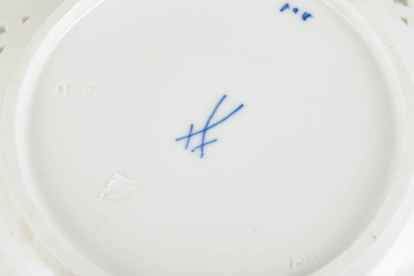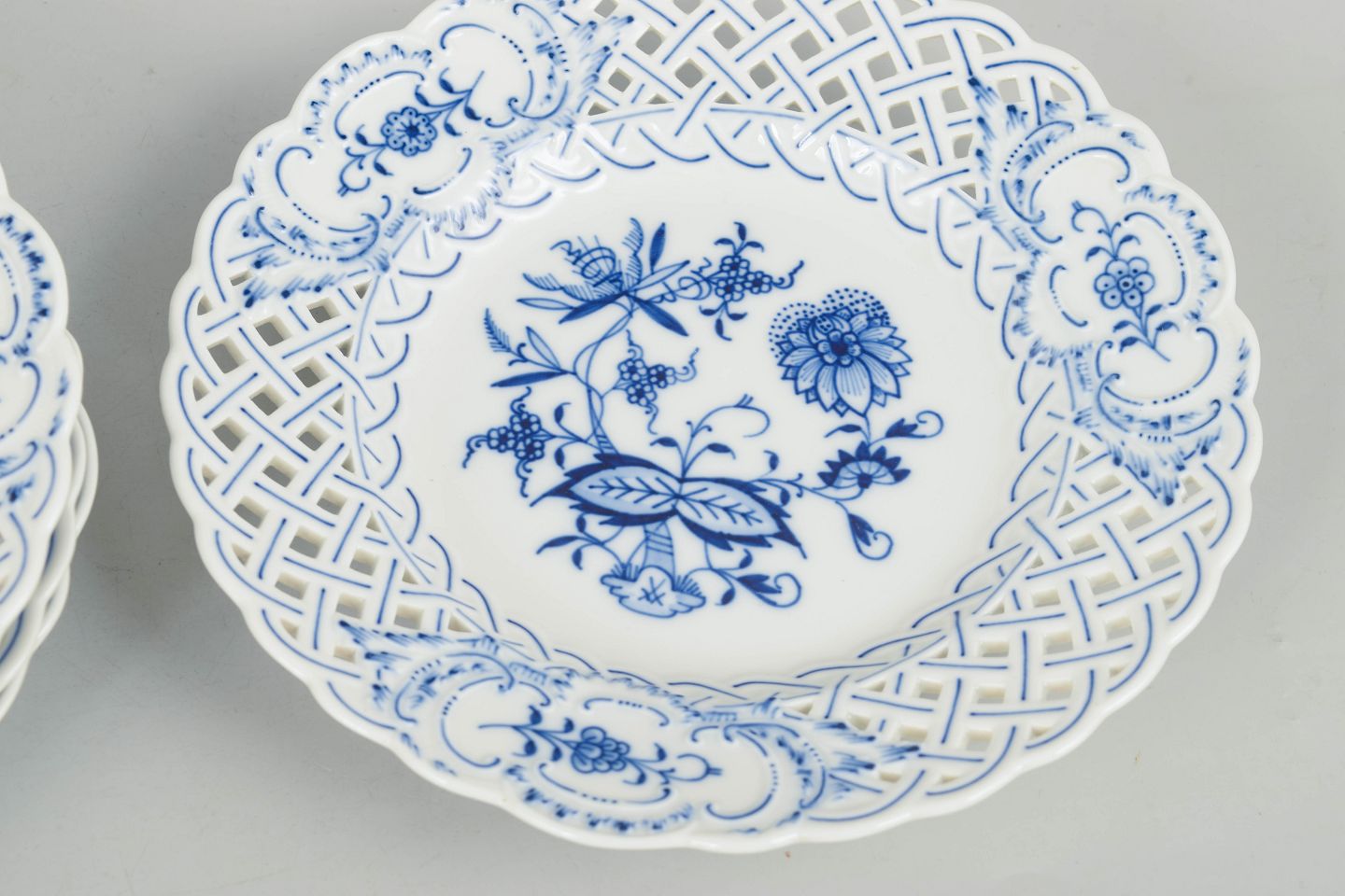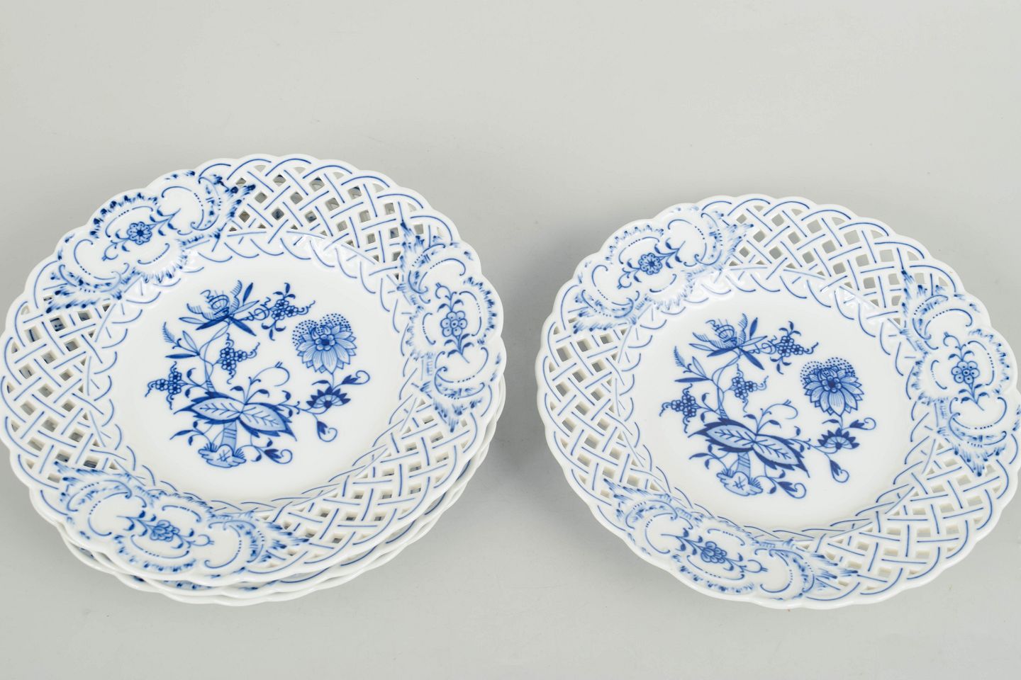 Fire tallerkener i porcelæn med klassisk blå håndmalet løgmønster og gennembrudt fane, fremstillet hos Meissen i midten af det 20. århundrede. Stemplet i bunden med Meissen krydsede sværd.