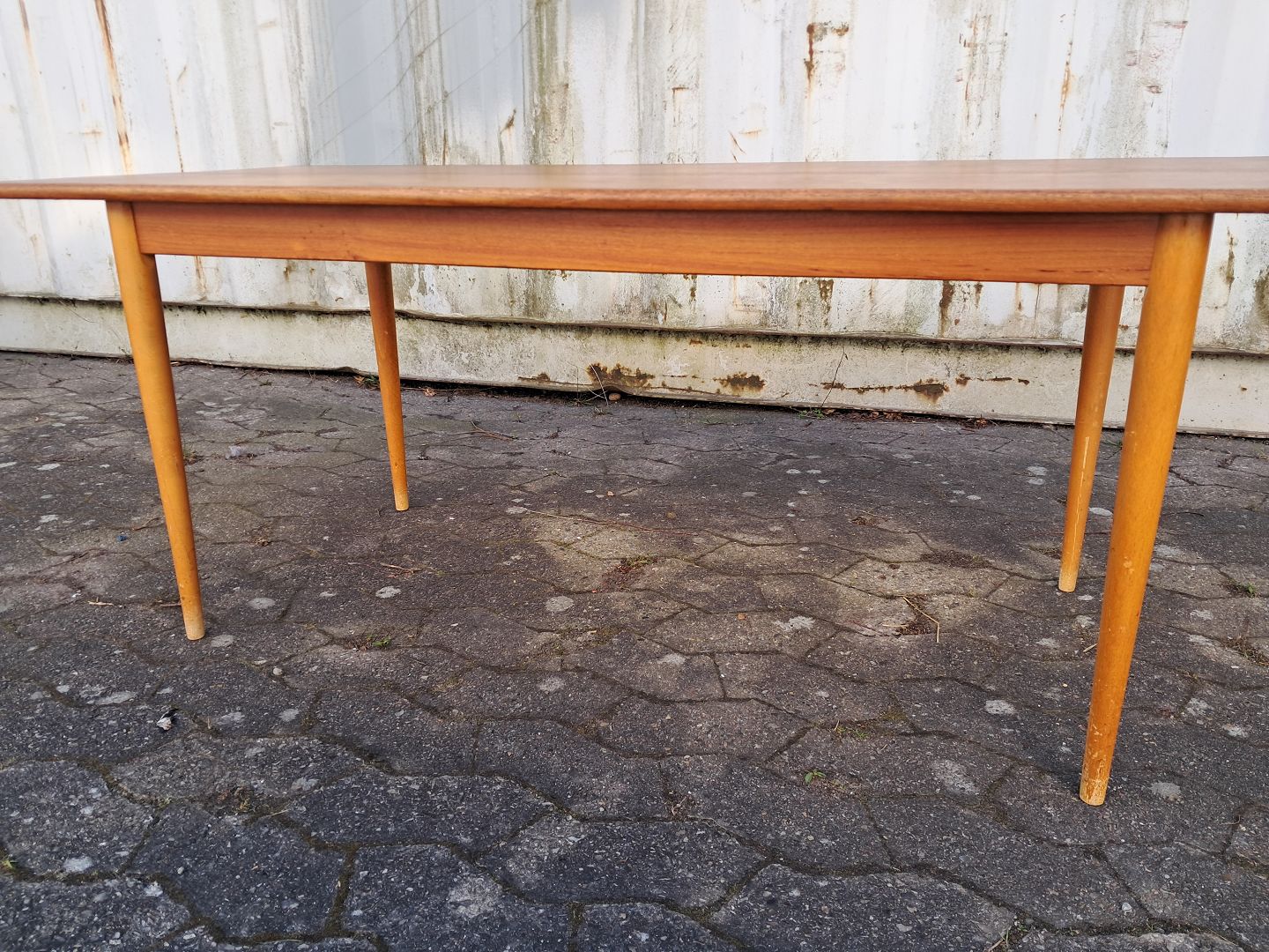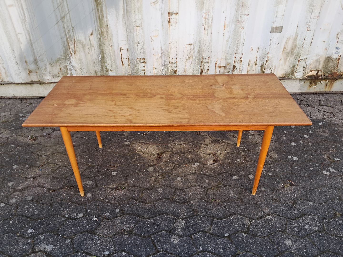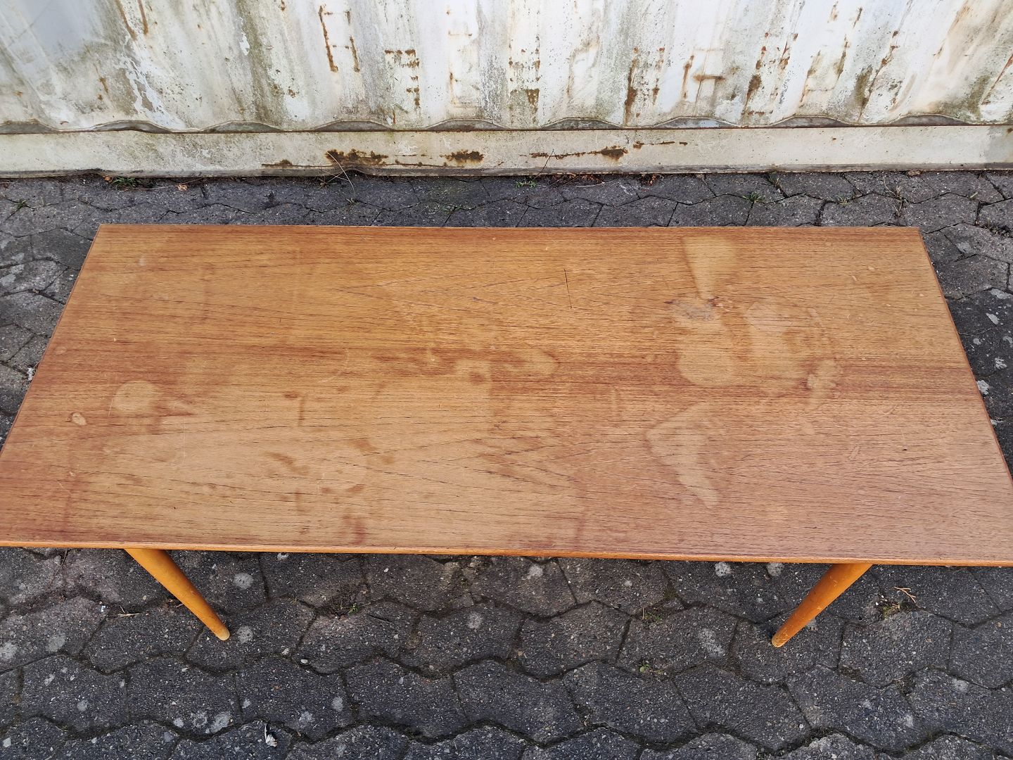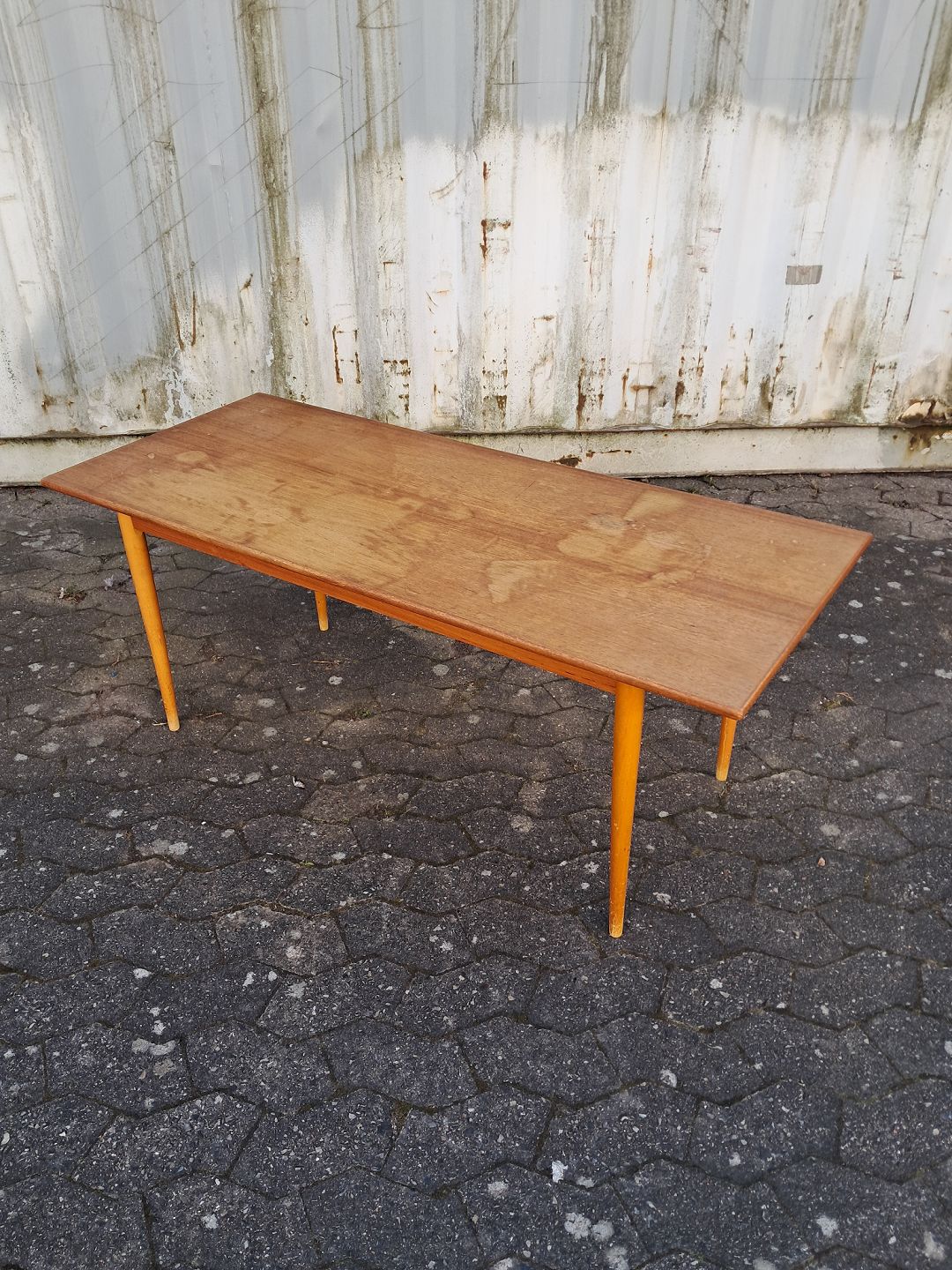 Sofabord i fineret teaktræ med ben i massivt bøgetræ, fra 1960erne.
