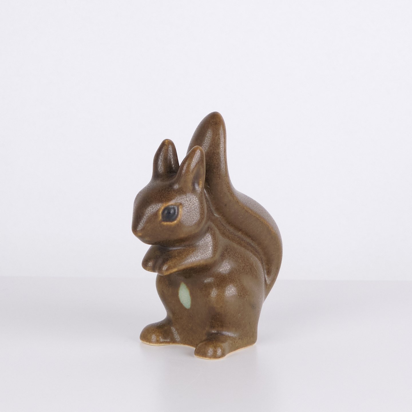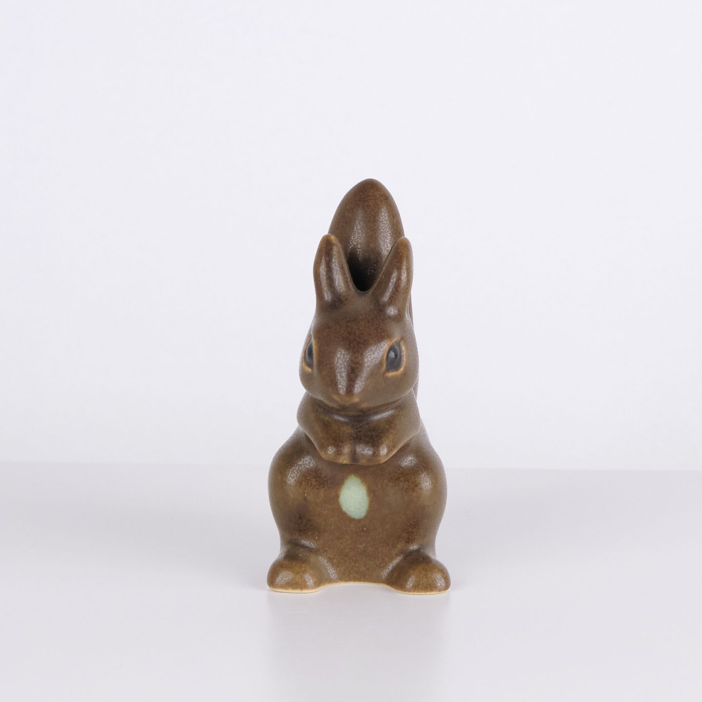 Harefigur af Knud Basse udført i brun glaseret keramik. Modellen viser opret siddende hare med samlet forpoter og markant haleform bagtil. Figuren er dekoreret med lys detalje på fronten og er et klassisk eksempel på Knud Basses populære dyrefigurer fra 1960’erne.