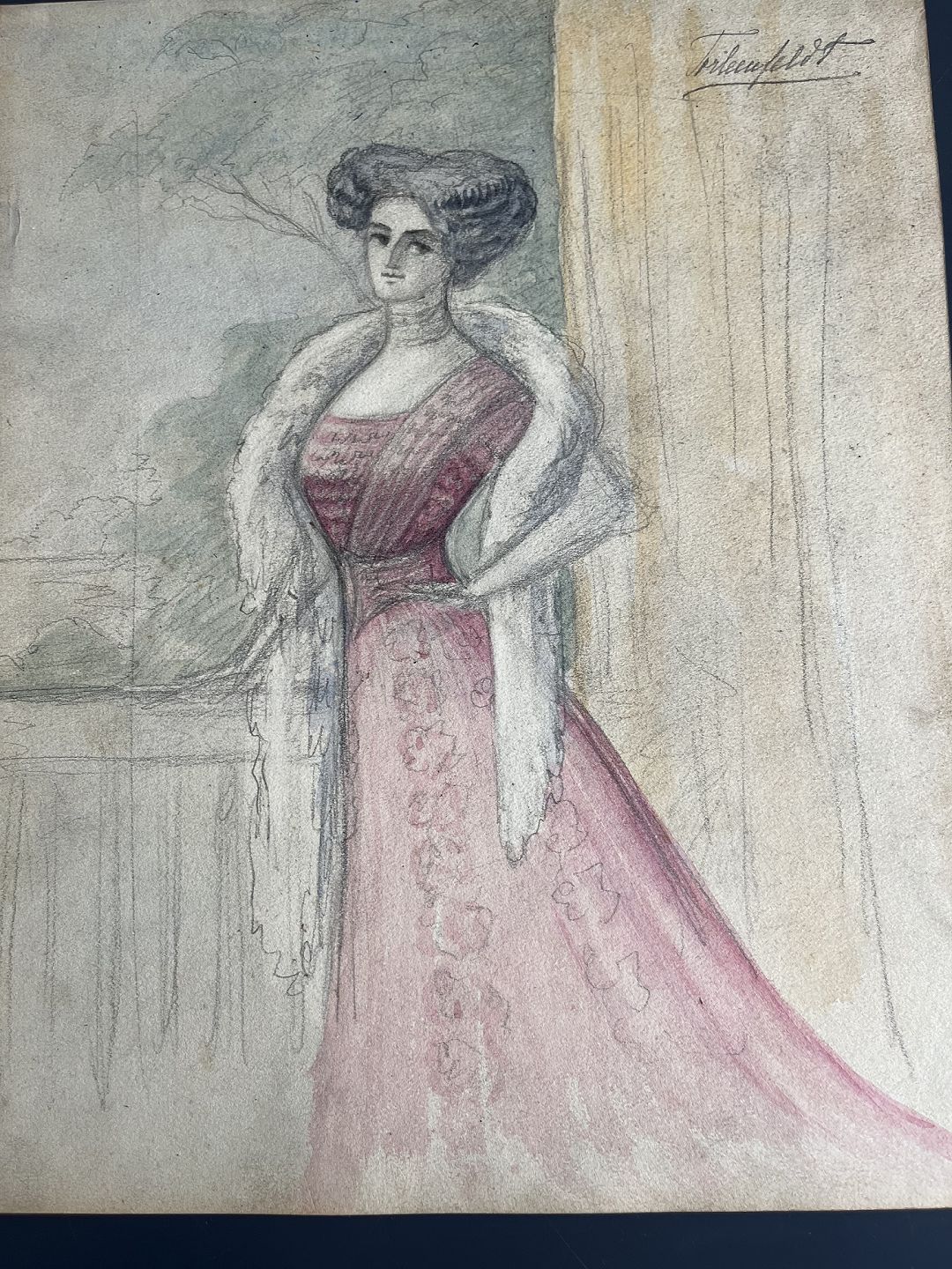 Bagpå tegning af smuk ung kvinde 1913 (bly/kul)