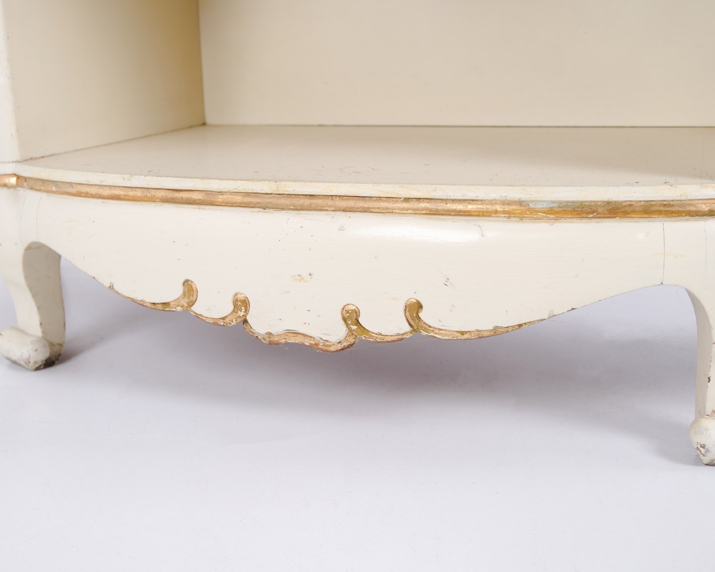 Buet skænk fremstillet af P. Svensen, N. Frihavnegade 15, København. Møblet er udført i malet træ med profilerede detaljer, forgyldte dekorationer og original marmorplade. Fronten har åben midterniche, lille skuffe samt to buede skabe med indvendige hylder. Klassisk empireinspireret form med buede sider, svungne ben og dekorative beslag. Velegnet som entrémøbel, konsol eller opbevaringsskænk.