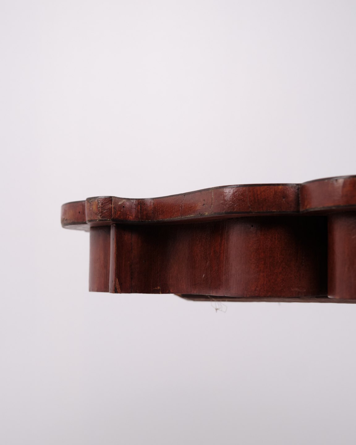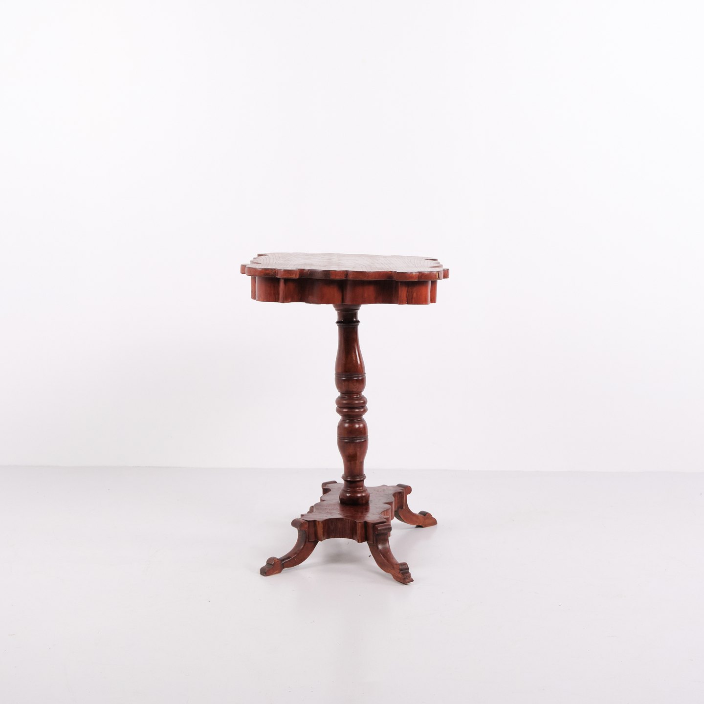 Antikt sidebord udført i mahogni med rektangulær profileret plade, drejet søjlefod og fire svungne ben. Bordet har klassiske proportioner og detaljer typiske for europæiske salon- og sideborde fra 1800-tallet. Velegnet som lampebord, konsolbord eller mindre entrébord. Mahogni var et foretrukket materiale i perioden på grund af styrke, glød og flot åretegning.