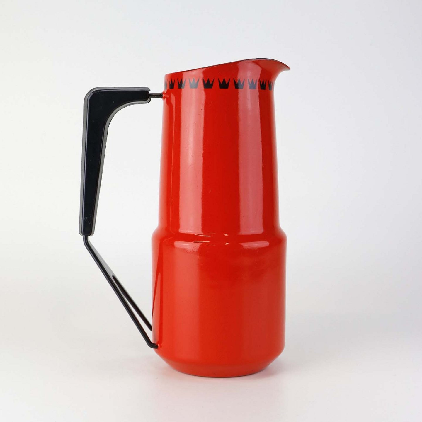 Dankok kande i metal belagt med rød, hvid og sort emalje og mønster af sorter tretakket kroner. Del af hanken er omgivet af sort plast.