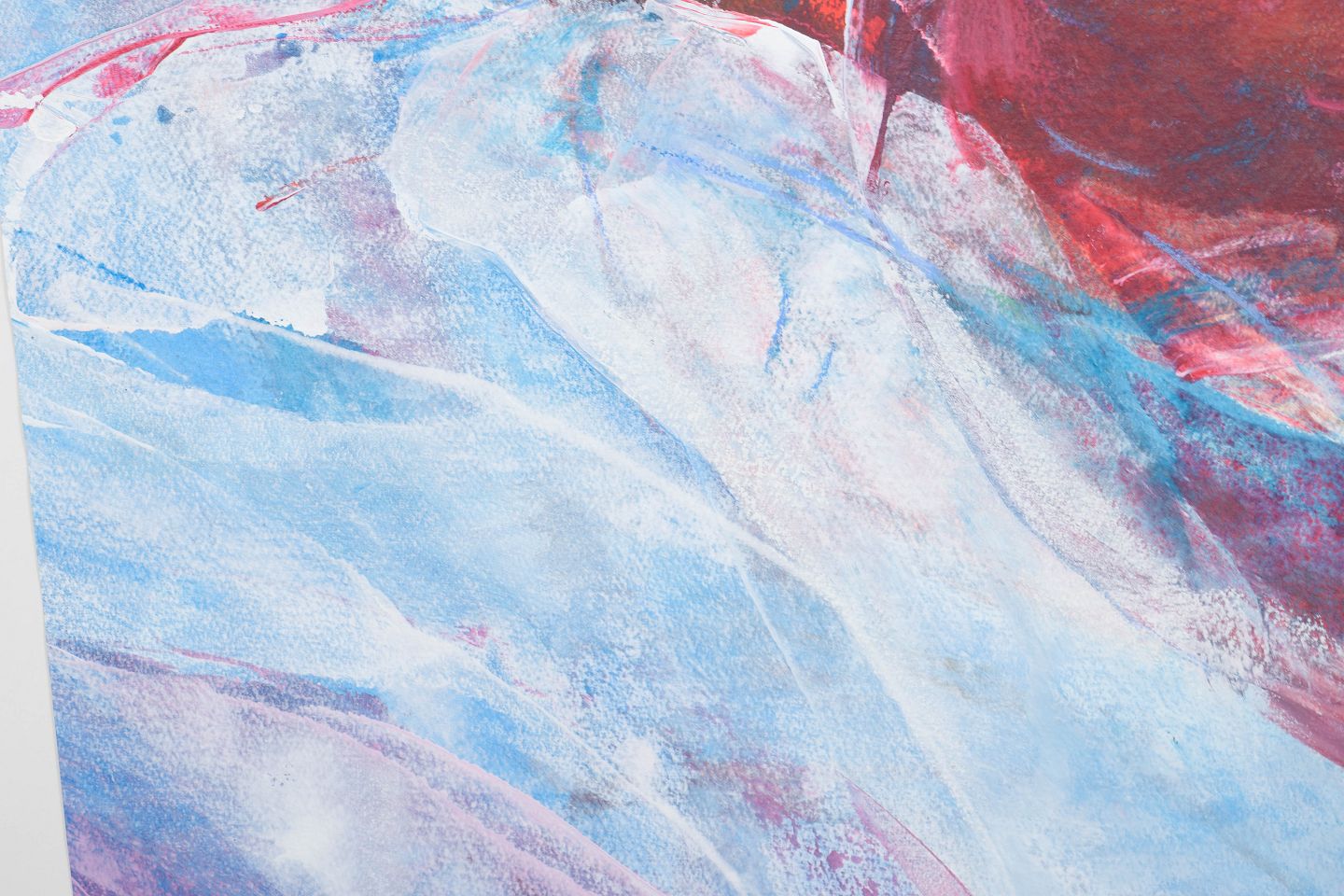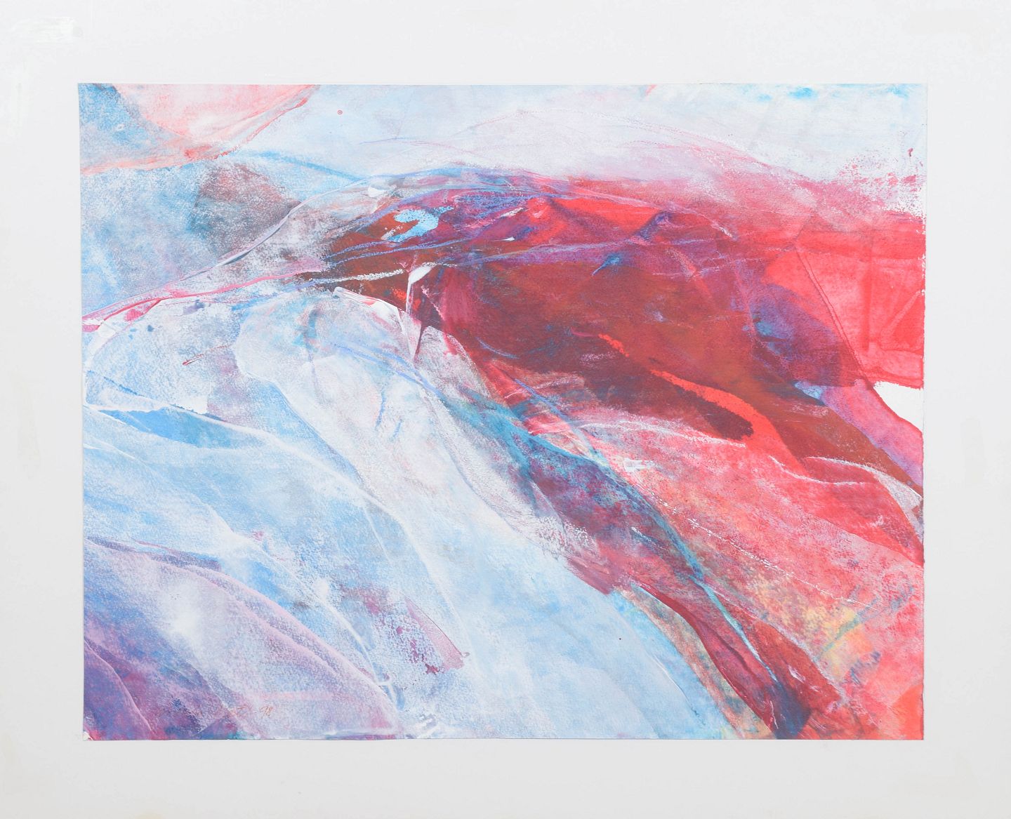 Abstrakt komposition med eksplosive farvefelter i røde, blå og lyse nuancer, udført i mixed media med dynamisk og gestisk udtryk. Signeret og dateret 1998. Udstillet ved Firenze Biennalen 1999.