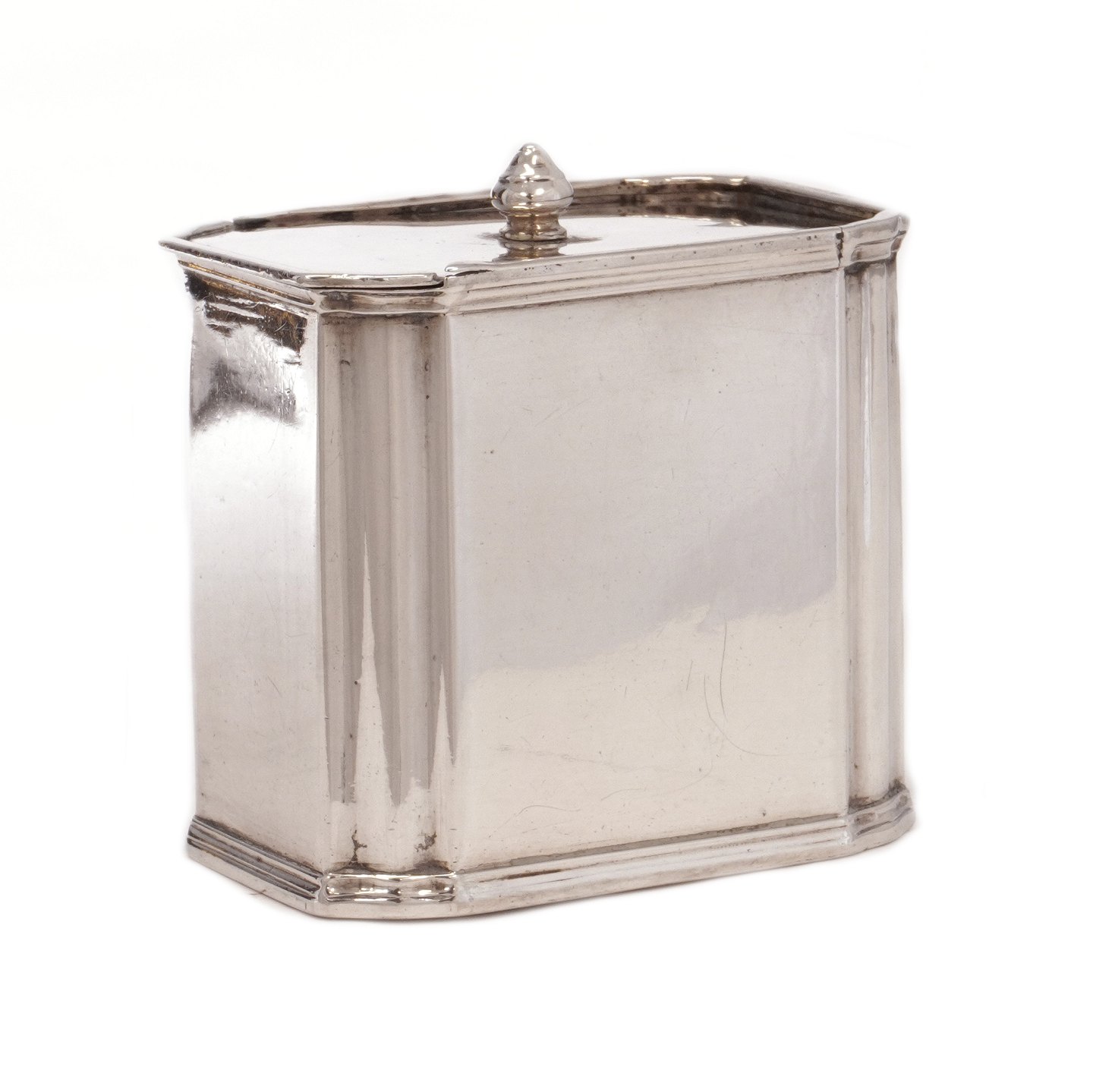 Sjælden Regence tedåse med skydelåg i sølv udført af Johan Mehl, Viborg, 1725-65. H: 8cm. B: 7,7cm