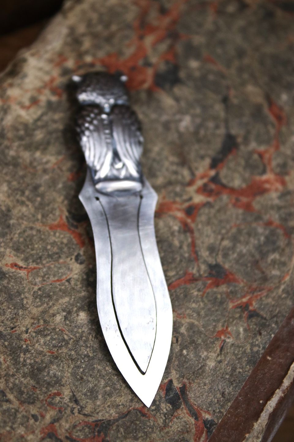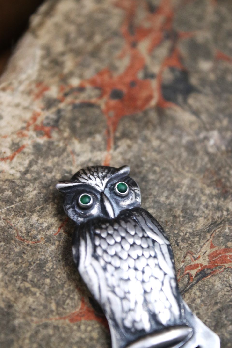 Gammelt bogmærke i sølv i form af en lille ugle med grønne glas øjne...