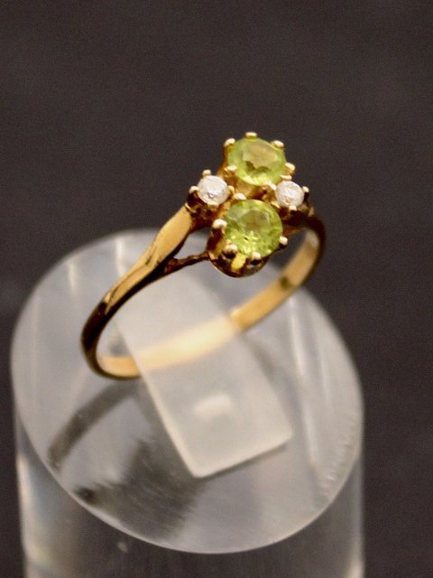 14 karat guld ring med 2 klare og to lysegrønne stene