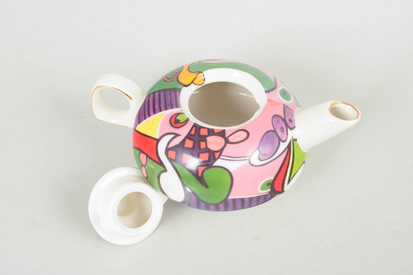 Tekande i porcelæn med låg, mærket Picasso. Rundet form med farverig dekor i stærke kontraster samt guldkant på knop og tud, typisk for sen 1900-tals produktion.