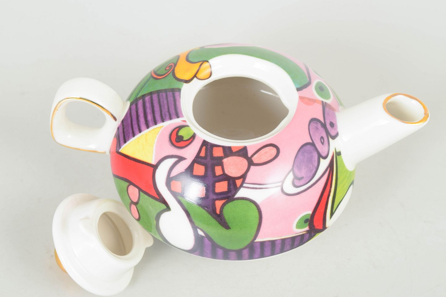 Tekande i porcelæn med låg, mærket Picasso. Rundet form med farverig dekor i stærke kontraster samt guldkant på knop og tud, typisk for sen 1900-tals produktion.