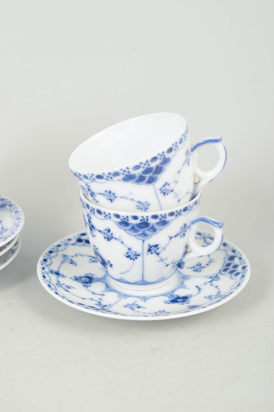 Royal Copenhagen Musselmalet Halvblonde, sæt af fire kaffekopper med underkopper.