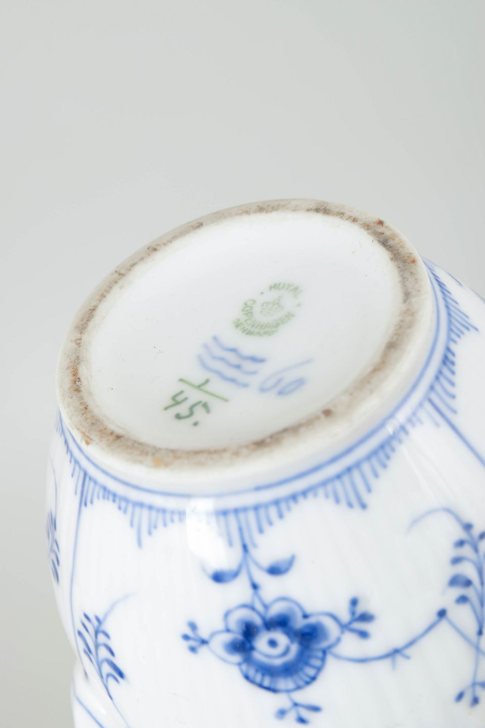 Den Kongelige Porcelænsfabrik blev grundlagt i 1775 i København og er kendt for sin høje kvalitet og håndværksmæssige tradition. Musselmalet riflet er fabrikkens mest ikoniske stel, introduceret i 1775 og stadig håndmalet efter gamle teknikker, hvilket gør hvert stykke unikt.