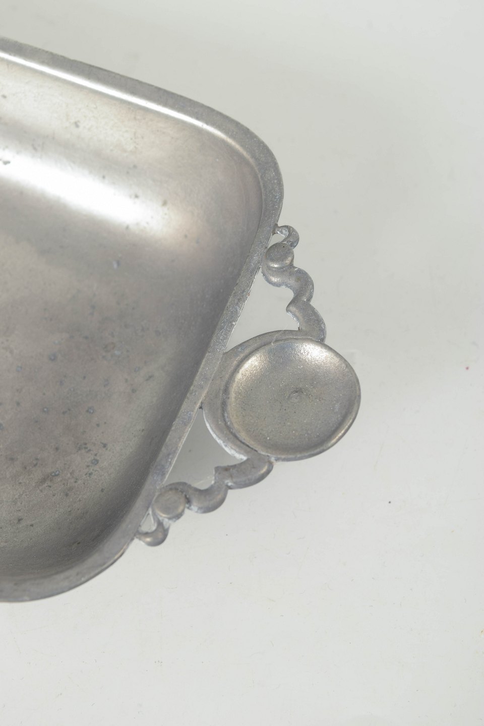 Rektangulært tinfad med integrerede greb, model 1547, udført i en enkel og funktionel form med bløde afrundinger. Klassisk dansk design fra mellemkrigstiden med let patineret overflade.