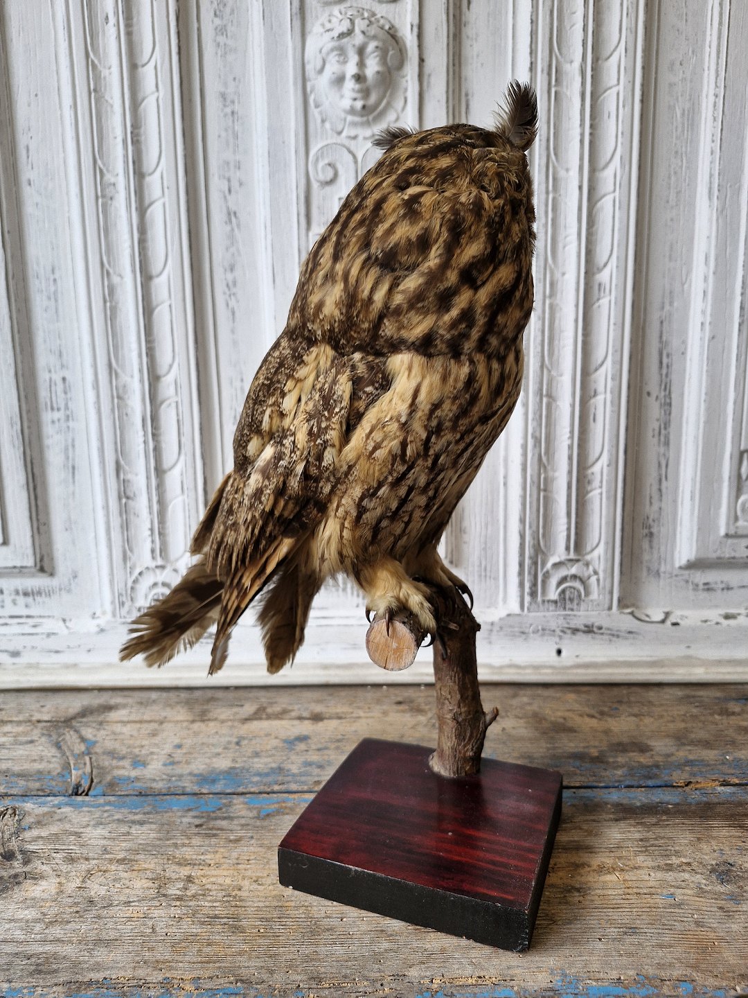Udstoppet skov hornugle i flot stand monteret på natur gren