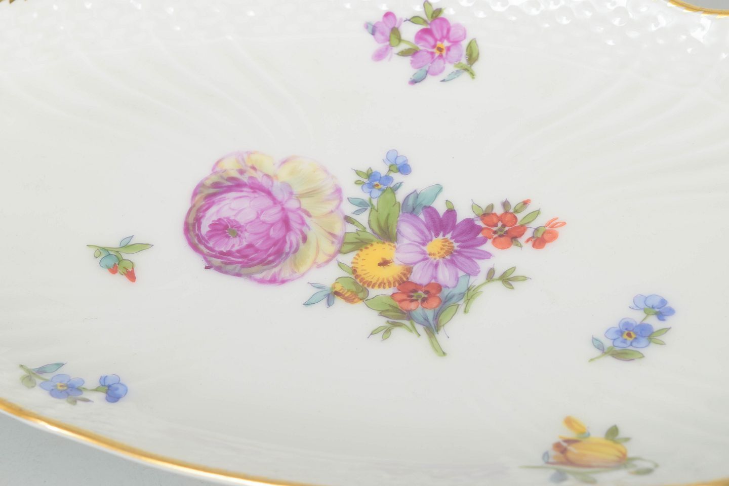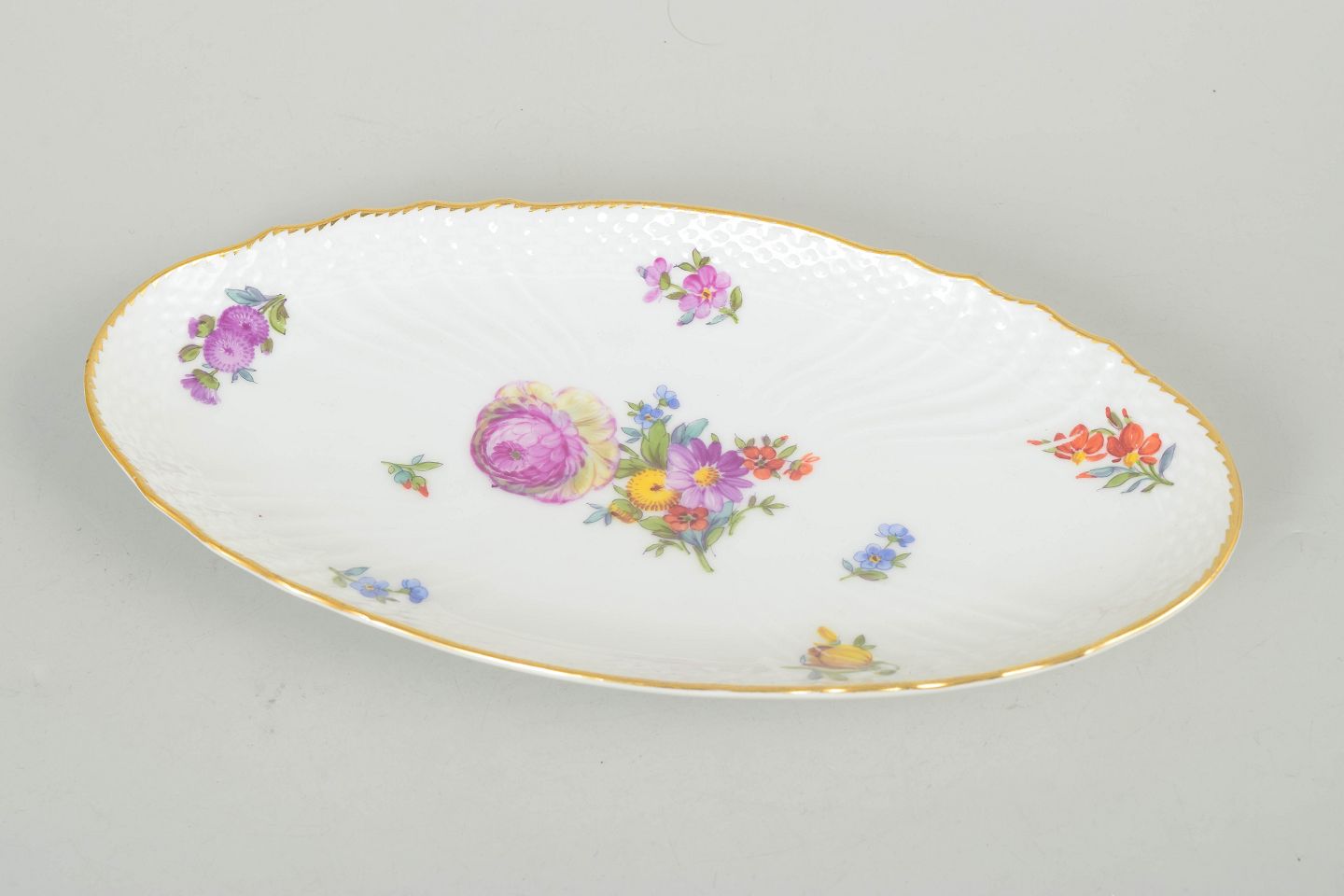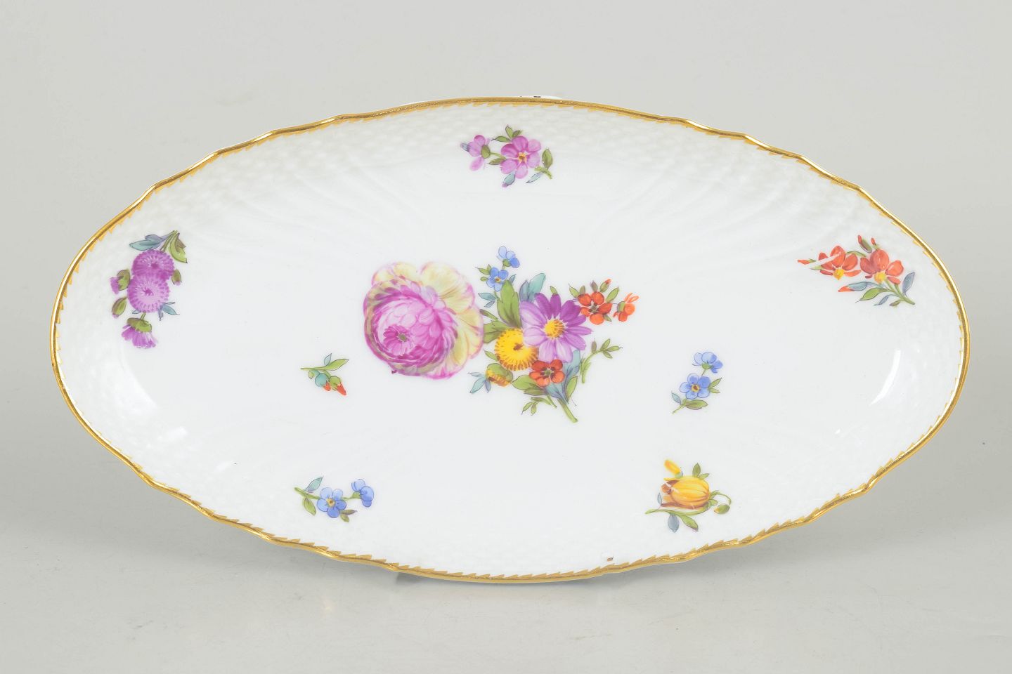 Ovalt fad i porcelæn dekoreret med håndmalede blomster i saksisk blomst-mønster og afsluttet med forgyldt kant. Model 1221/1689. 1. sortering.