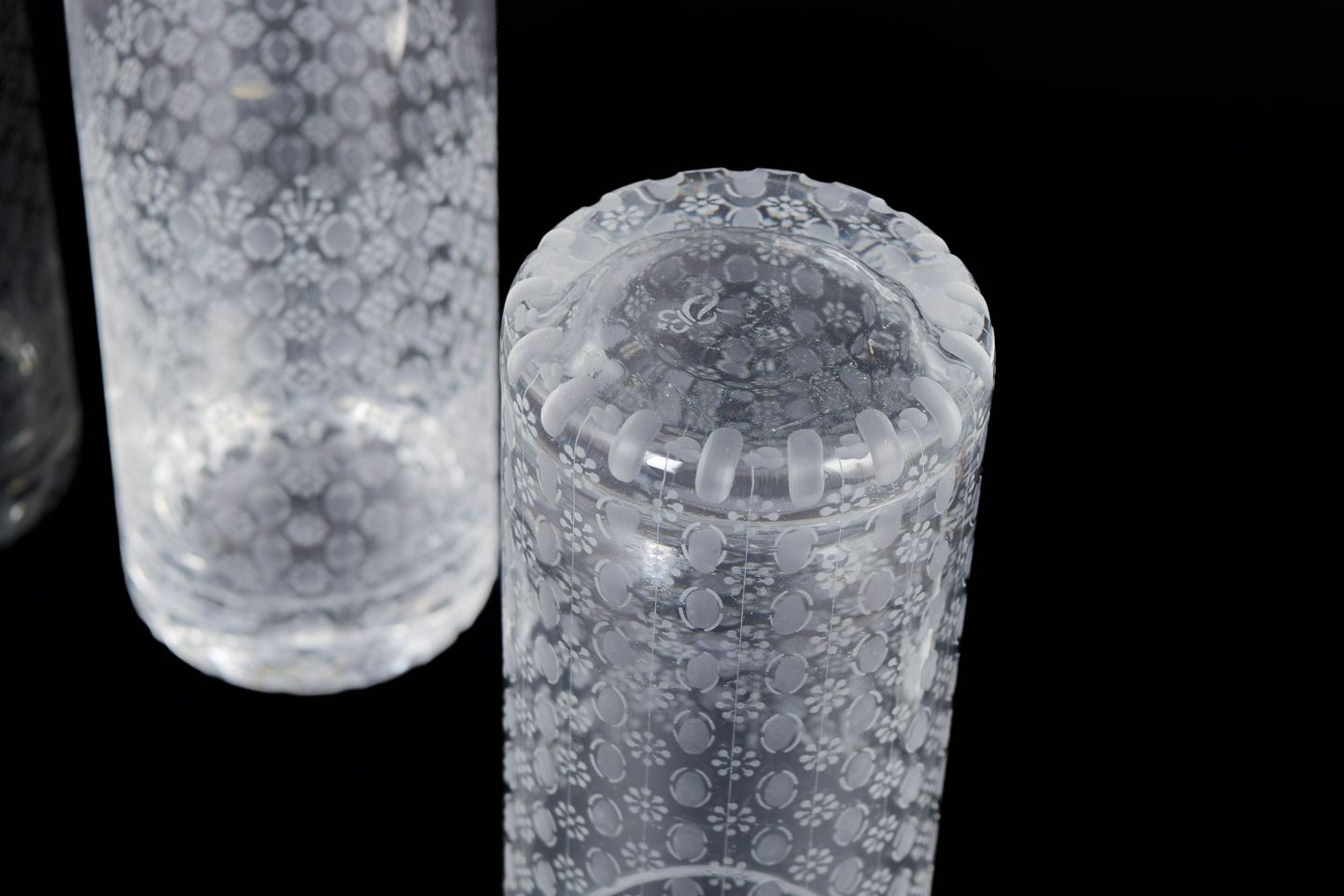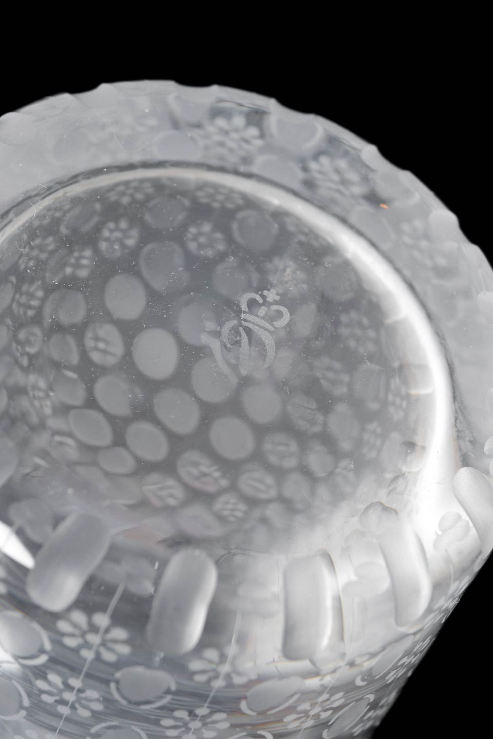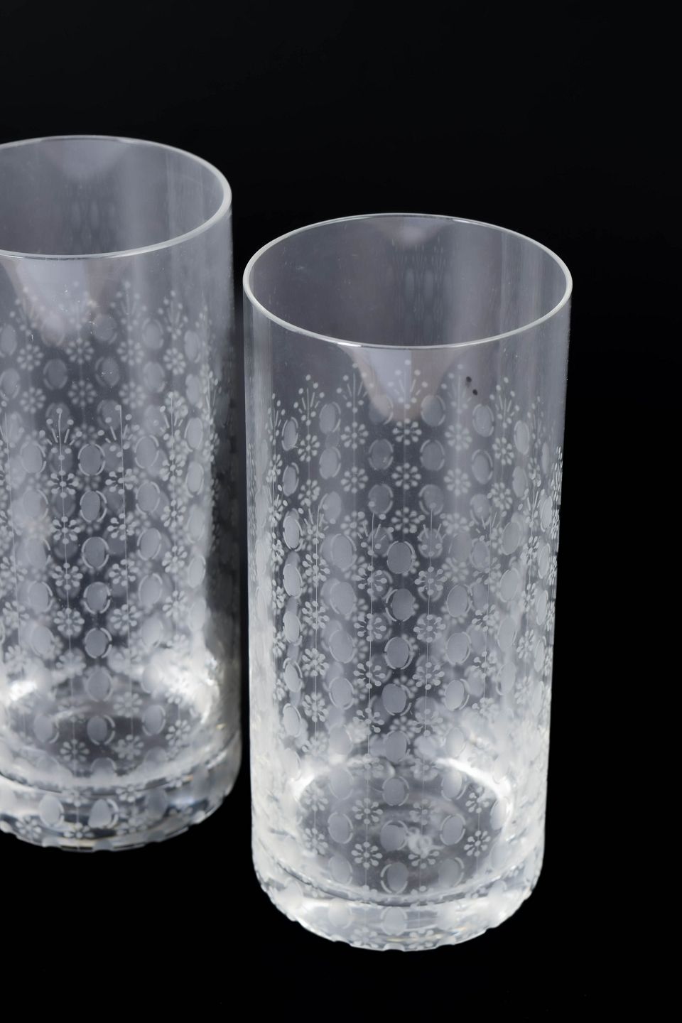 Dekorative drikkeglas i klart glas med fin sandblæst dekoration i karakteristisk romantisk mønster. Model “Romanze”.