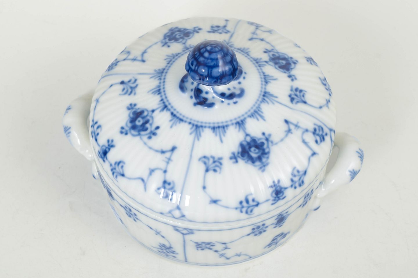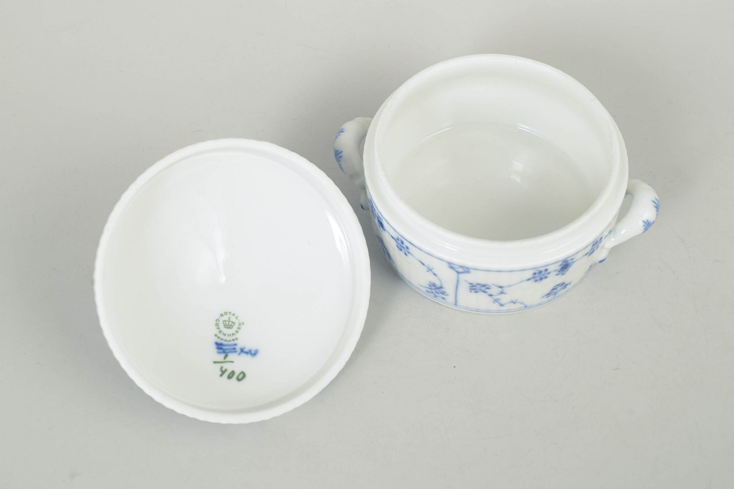 Klassisk sukkerskål i hvidt porcelæn med håndmalet blå musselmalet riflet dekoration, model 1/400 fra 1970’erne, 1. sortering.