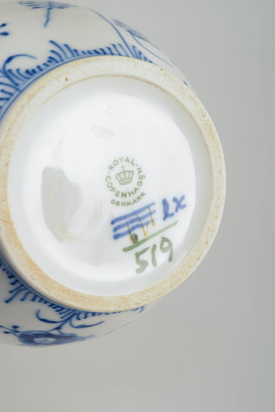 Klassisk kaffekande i hvidt porcelæn med håndmalet blå musselmalet riflet dekoration, model 1/519 fra 1970’erne, 4. sortering.