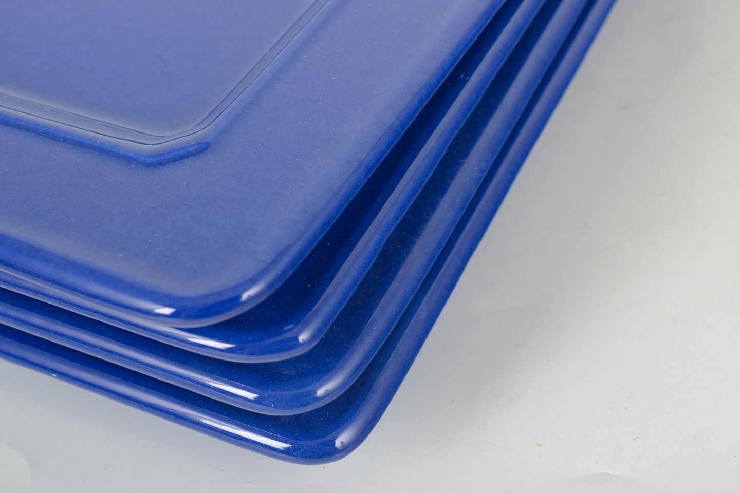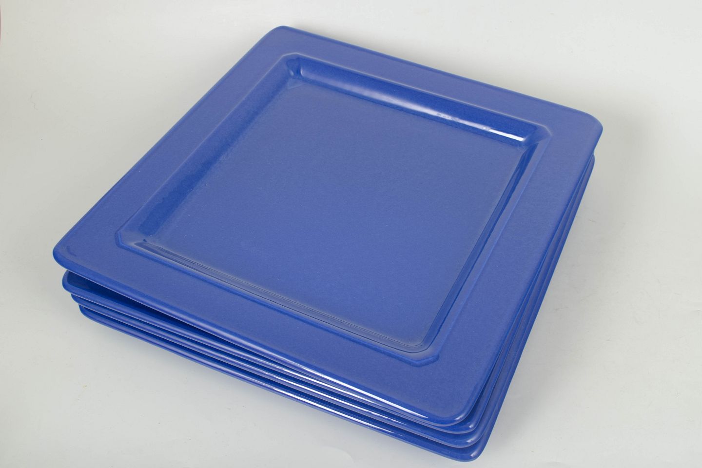 Enkelt og stilrent sæt i glaseret keramik bestående af fire store firkantede tallerkner i ensartet blå farve med blank overflade.