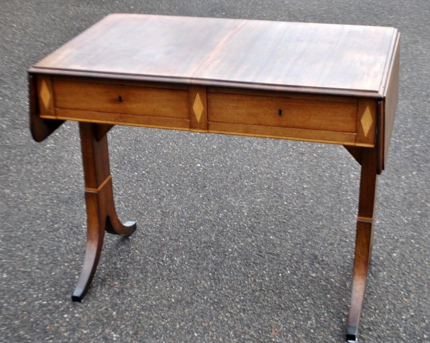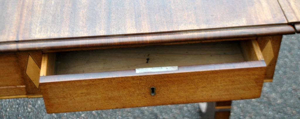 Arbejdsbord med klapper i mahogni med intarsia, ca. 1900. Danmark. Empireform. Med skuffe. L.: 88 cm. B.: 58 cm. H.: 77 cm. Opslået længde.: 132 cm.