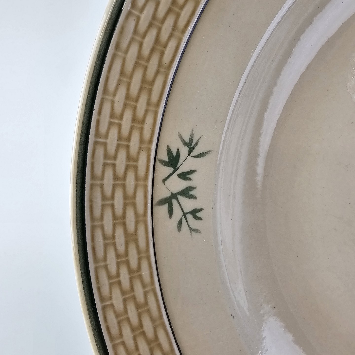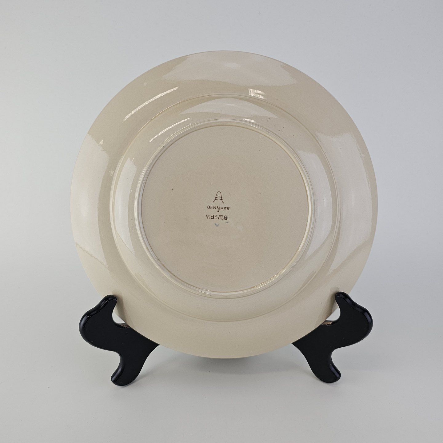 Fajancestel i stelform Viktoria II (Fletværk) med flettet kant og dekoration af en vibeæg blomst i violet og grøn, fremstillet i perioden 1934-1967