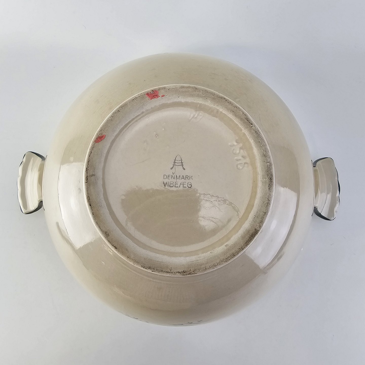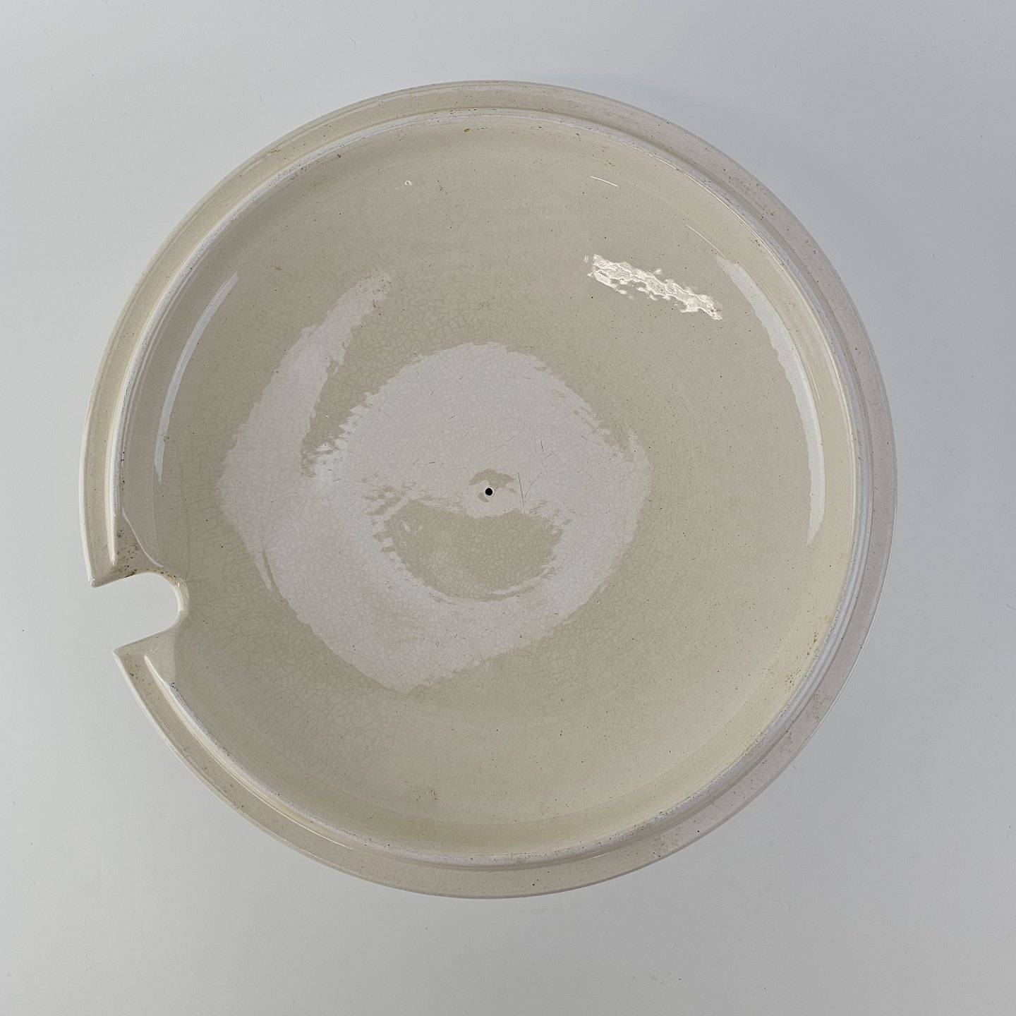 Fajancestel i stelform Viktoria II (Fletværk) med flettet kant og dekoration af en vibeæg blomst i violet og grøn, fremstillet i perioden 1934-1967