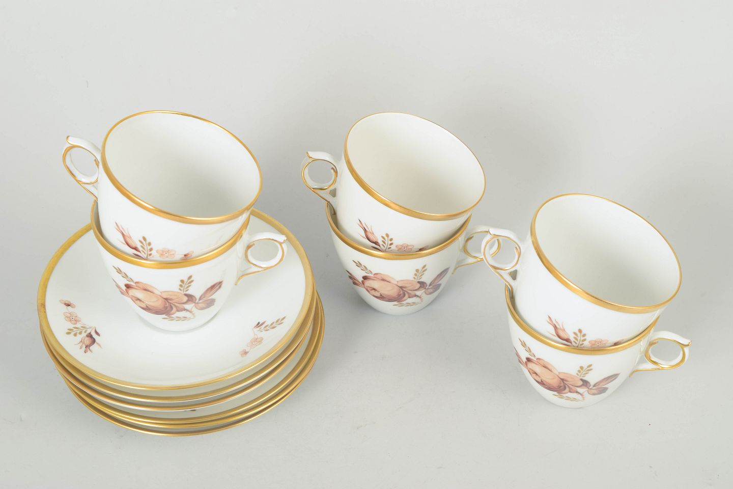 Elegant stel i hvidt porcelæn dekoreret med brun blomsterdekoration og guldkant. Model 688/9069. Første sortering.
