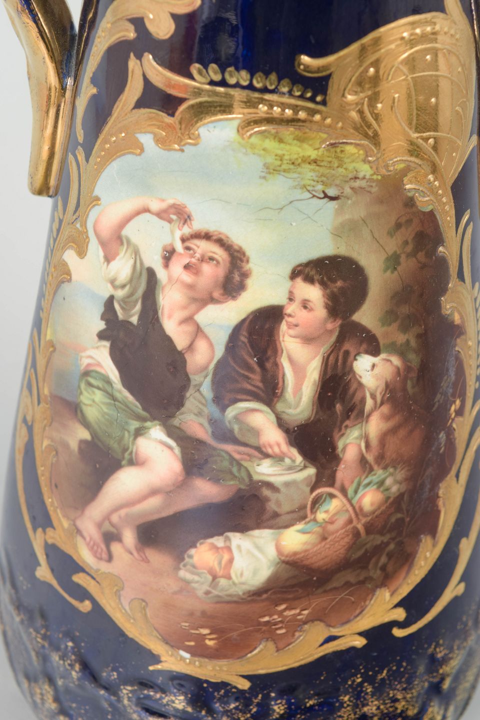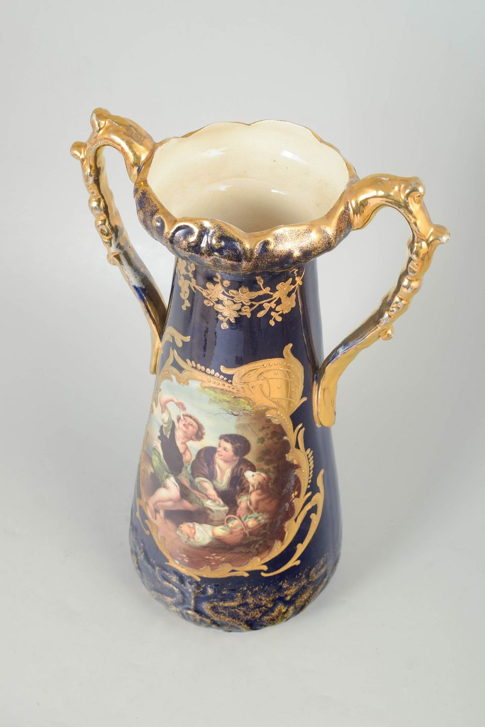 Høj, balusterformet vase i fajance med dyb koboltblå glasur, rigt dekoreret med forgyldte detaljer og centralt motiv med figurgruppe i klassisk stil.