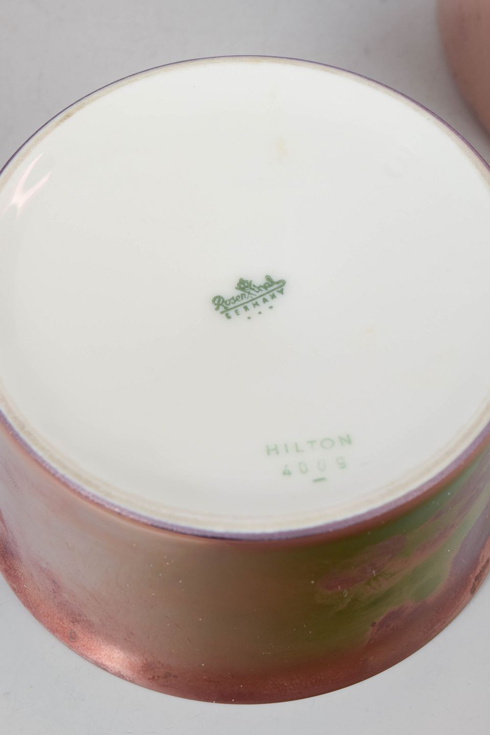 Kaffesæt fra Hilton-serien bestående af kaffekande, flødekande og sukkerskål i porcelæn, udført i karakteristisk form med rosa glasur og metalmonterede låg.