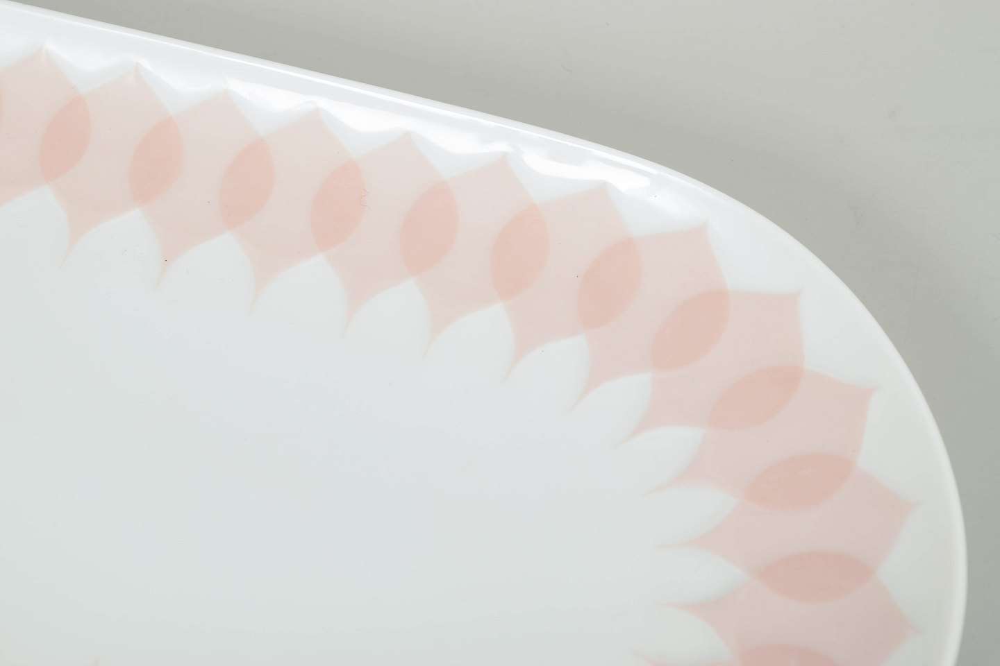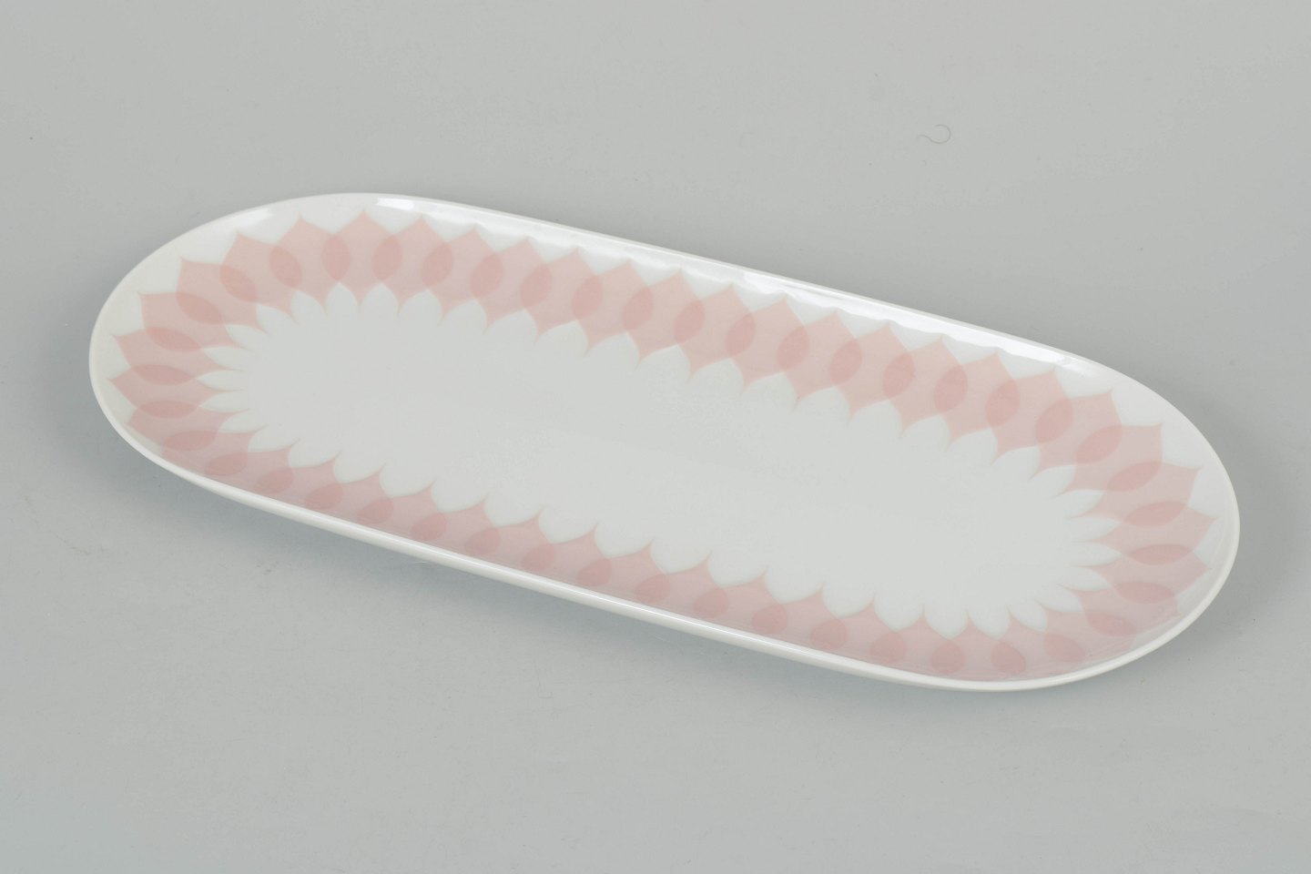 Dekorativt ovalt porcelænsfad med karakteristisk rosa “Lotus” dekoration langs kanten, udført i et gentaget bladmotiv med bløde overgange og grafisk rytme.