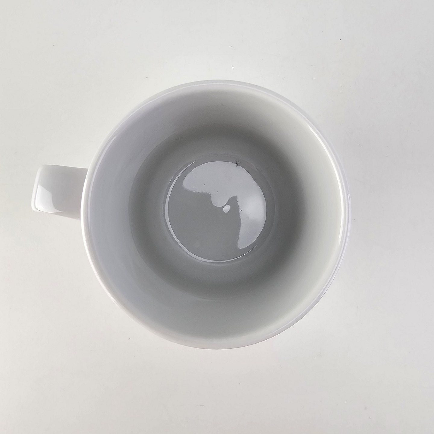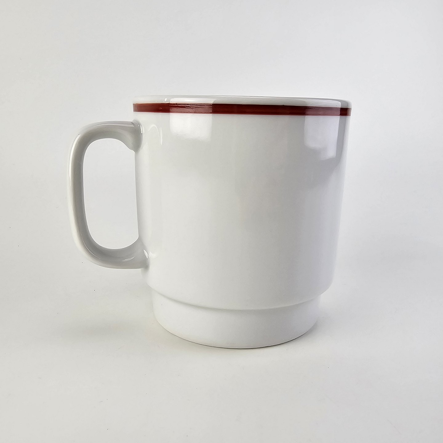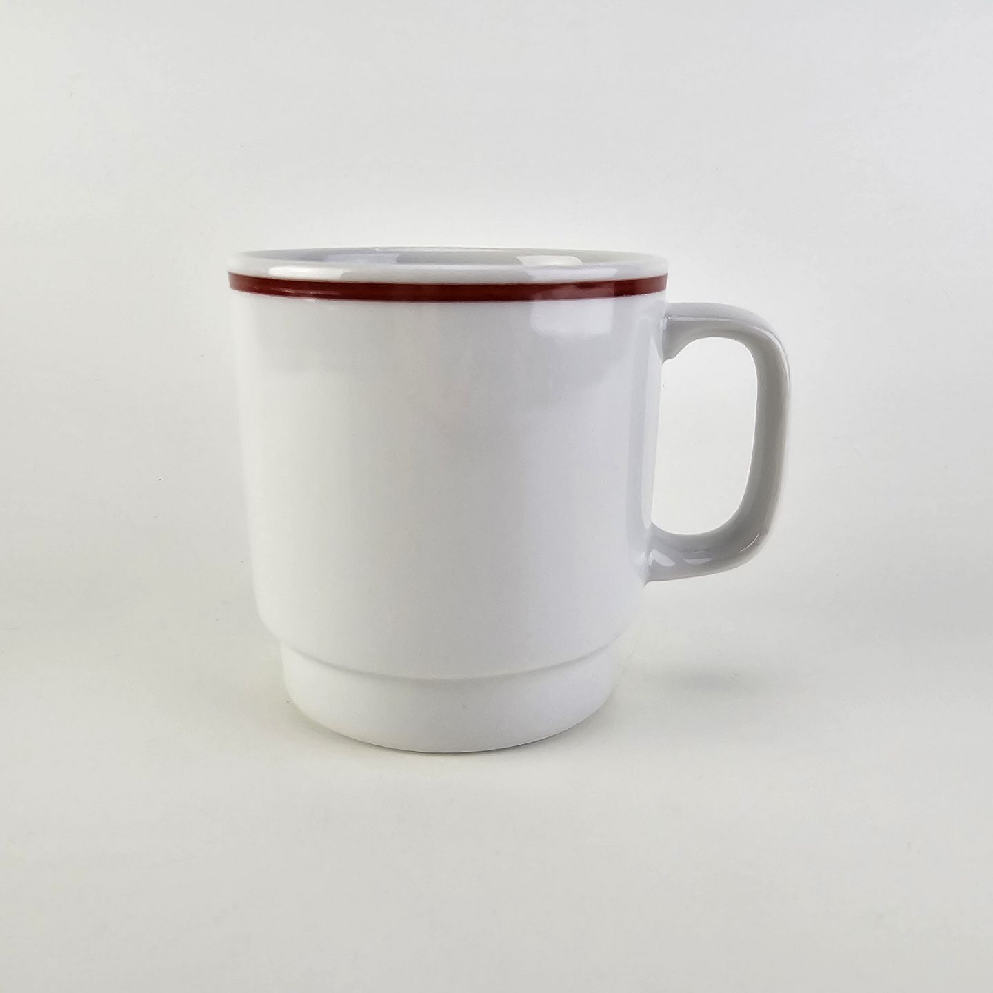 Krus i hvidt porcelæn med rød streg på kanten
