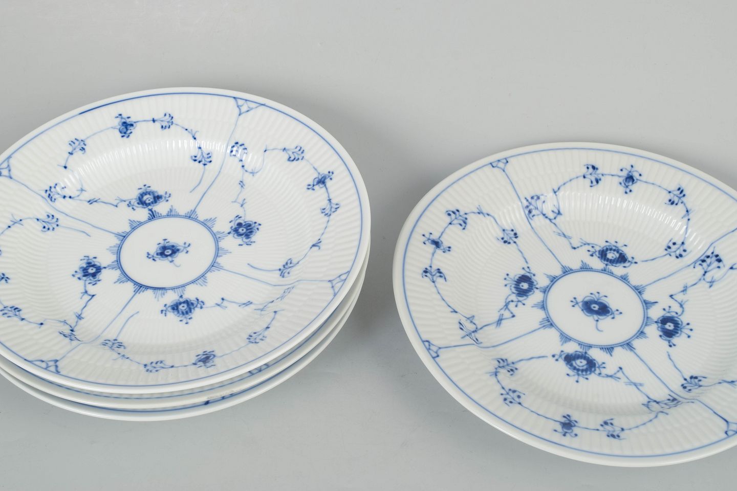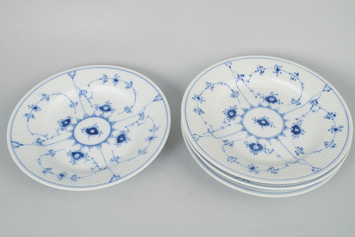 Royal Copenhagen Musselmalet Riflet, sæt af fire middagstallerkener.