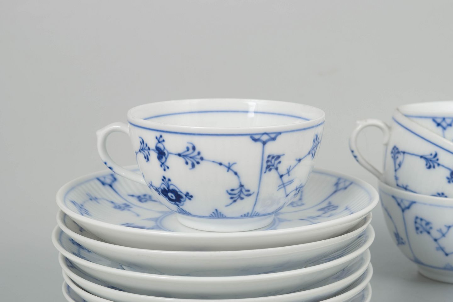 Royal Copenhagen Musselmalet Riflet, sæt af seks kaffekopper med underkopper.