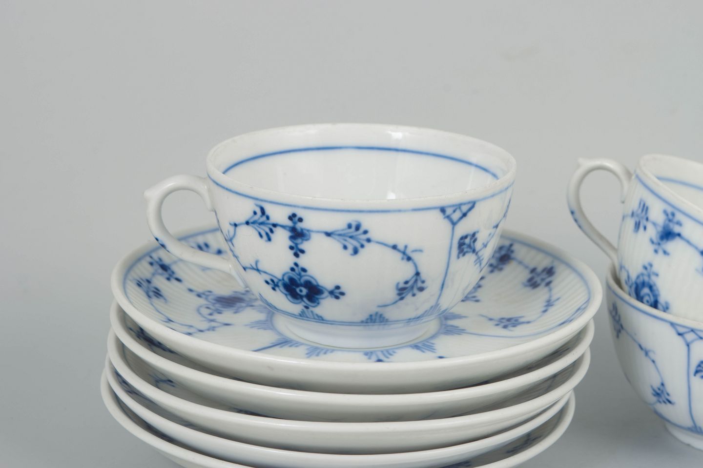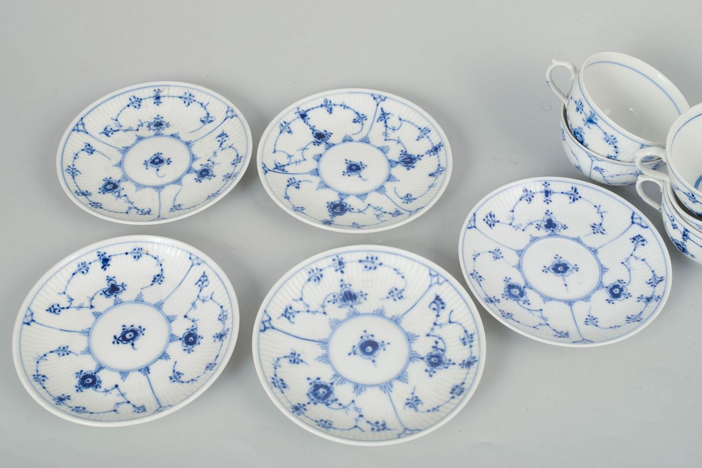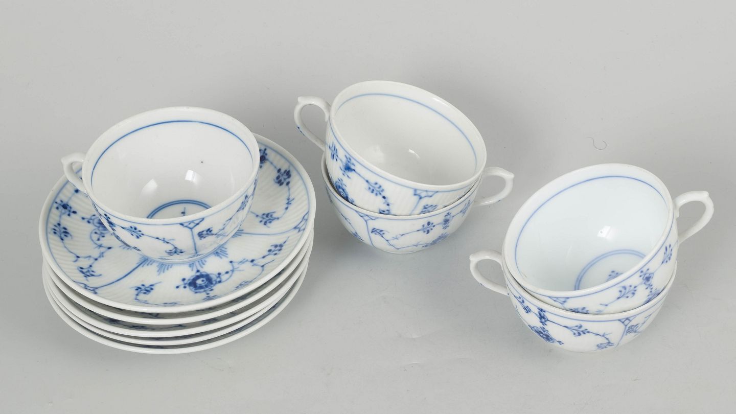 Royal Copenhagen Musselmalet Riflet, sæt af fem kaffekopper med underkopper.