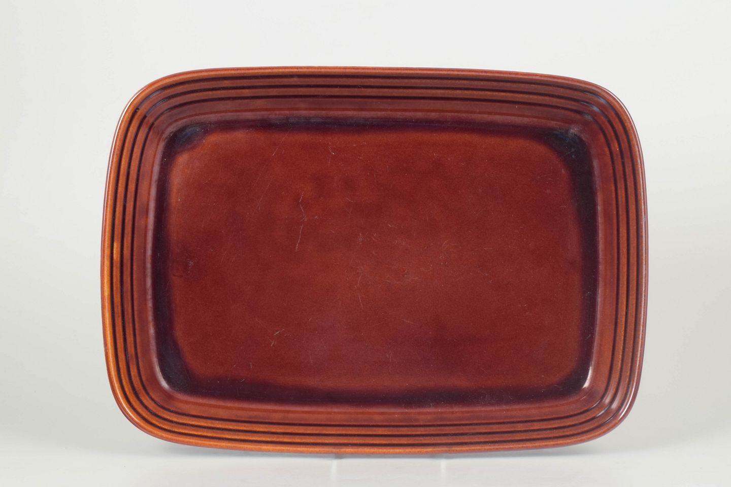 Stort rektangulært serveringsfad i stentøj fra Rustik-serien med varm brun glasur og karakteristisk rillet kant. Model formgivet i 1970’erne med funktionelt og tidløst svensk formsprog.